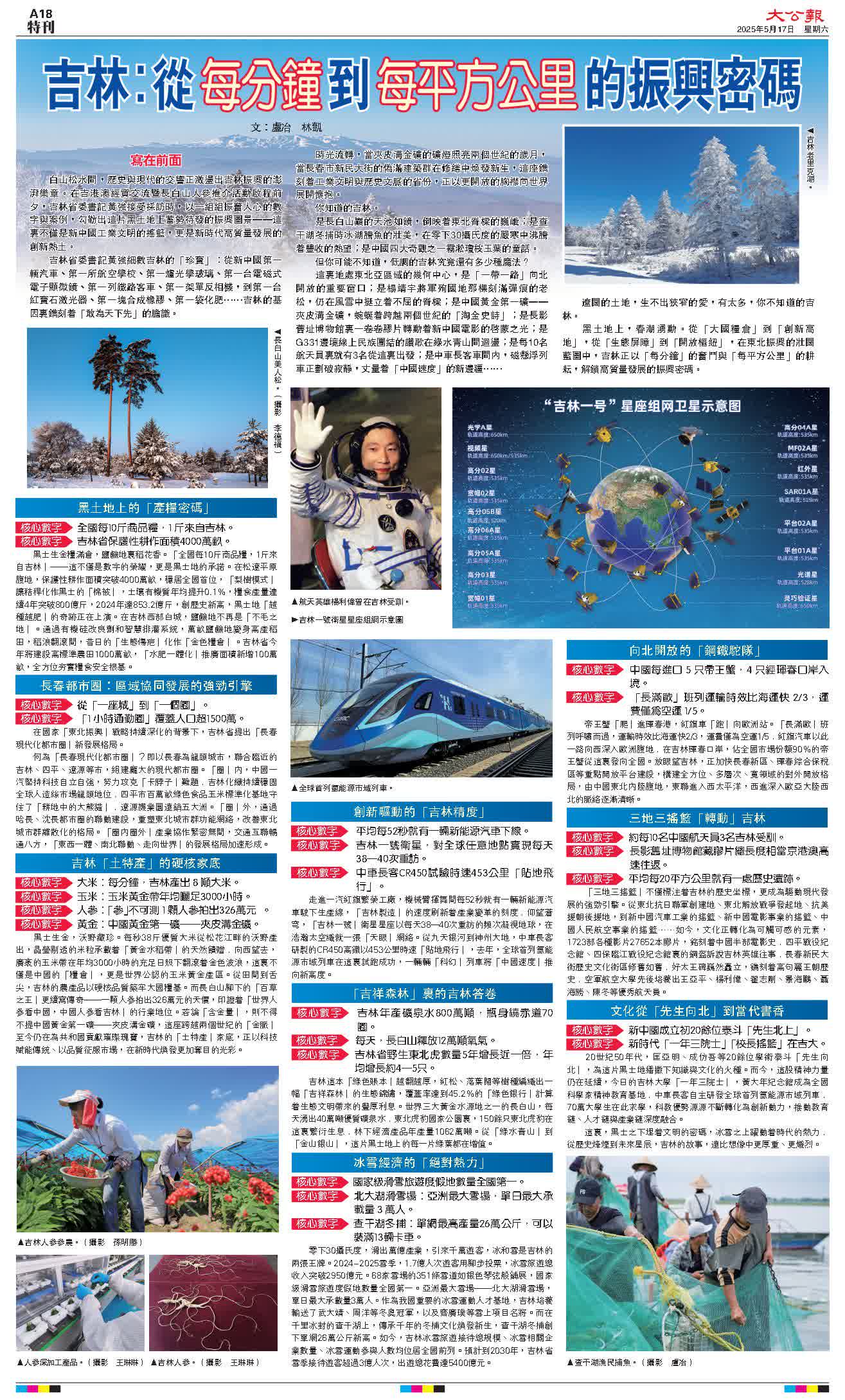 走進一汽紅旗繁榮工廠,機械臂揮舞間每52秒就有一輛新能源汽車駛下生產線,「吉林製造」的速度刷新着產業變革的刻度;仰望蒼穹,「吉林一號」衛星星座以每天38—40次重訪的頻次凝視地球,在浩瀚太空織就一張「天眼」網絡。從九天銀河到神州大地,中車長客研製的CR450高鐵以453公里時速「貼地飛行」,去年,全球首列氫能源市域列車在這裏試跑成功,一輛輛「科幻」列車將「中國速度」推向新高度。