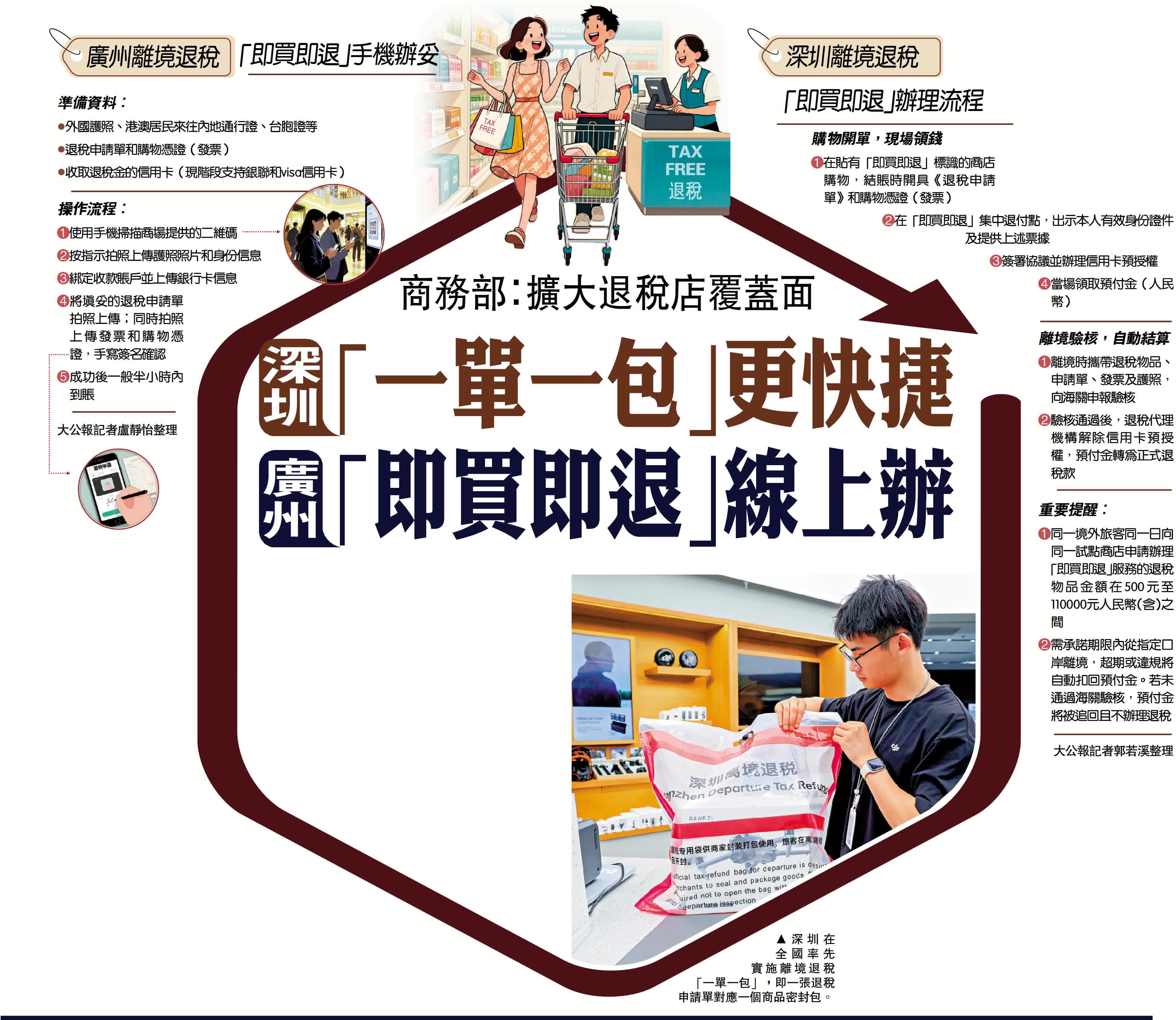 香港文匯報頭版報道。商務部日前在北京召開全國優化離境退稅政策擴大入境消費工作推進會。會議指出,發展離境退稅是大力提振消費的重要抓手,各地要加快推進擴商店、增商品、優服務工作,着力擴大退稅商店覆蓋面,擴大入境消費。目前,深圳在「即買即退」的基礎上,再推出離境退稅「一單一包」,旅客離境時商品查驗時間只需幾分鐘;而廣州則推出「店內即買即退」線上辦理,退稅金額五分鐘內傳入個人賬戶,有港人大讚:「全程毋須離開商店,好方便。」點此閱讀詳情