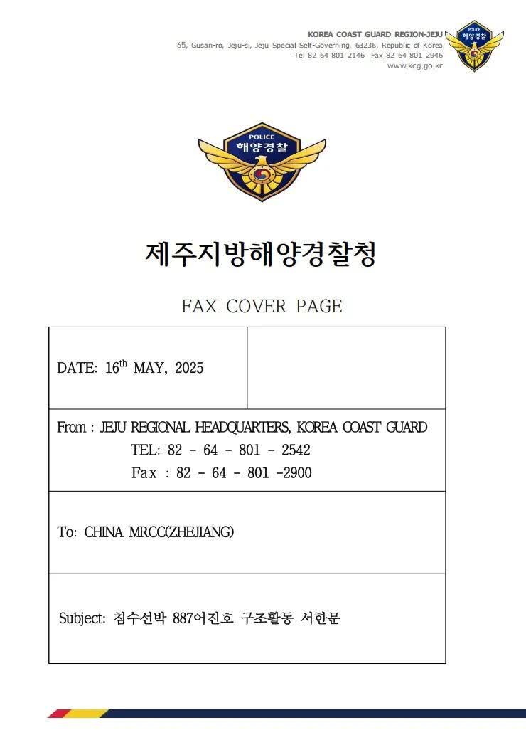 5月16日,浙江省海上搜救中心收到了一封來自韓國濟州地方海洋警察廳的感謝信。信中,韓國濟州地方海洋警察廳對浙江省海上搜救中心在韓國籍漁船「887EOJINHO」機艙進水險情中所展現的高效協同和快速救援表達衷心感謝。