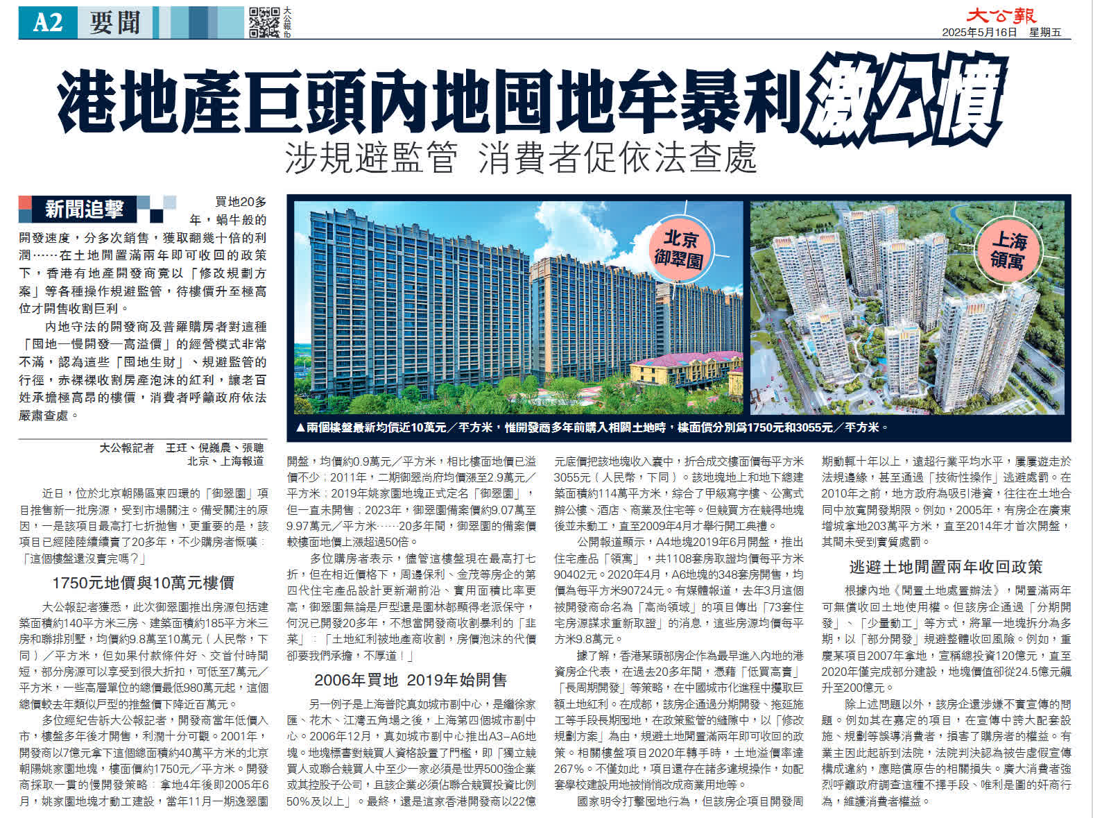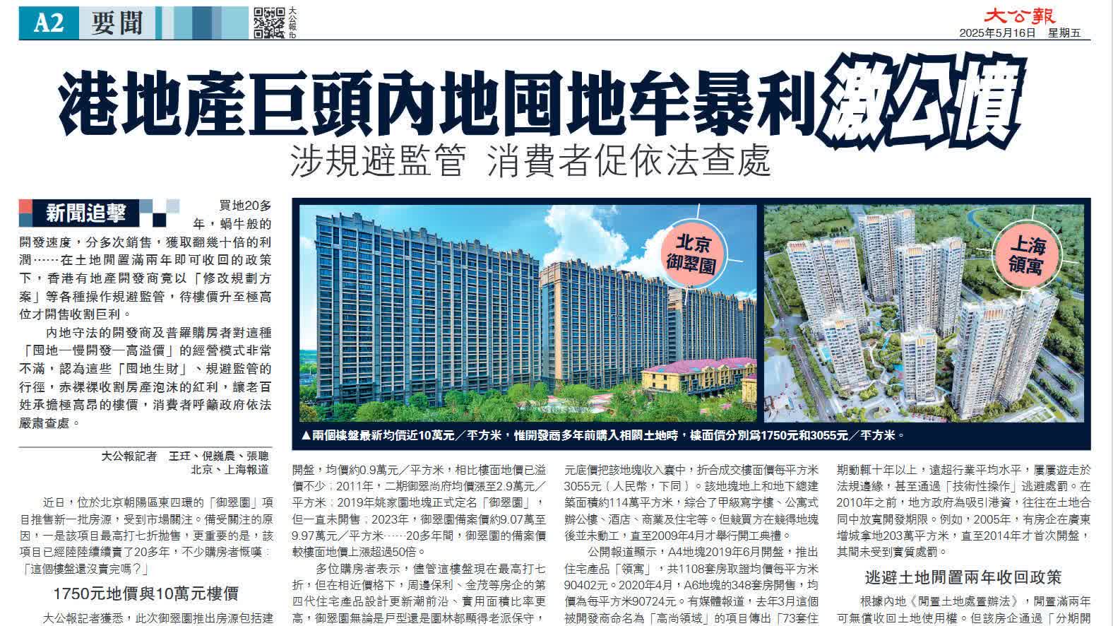 (大公報記者 龔學鳴)《大公報》5月16日刊登《港地產巨頭內地囤地牟暴利激公憤》一文,在社會各界引發強烈反響,相關話題在微博上閱讀量迅速突破1200萬。網民普遍認為,該地產開發商多年來囤地牟利,為一己私利阻礙當地發展。