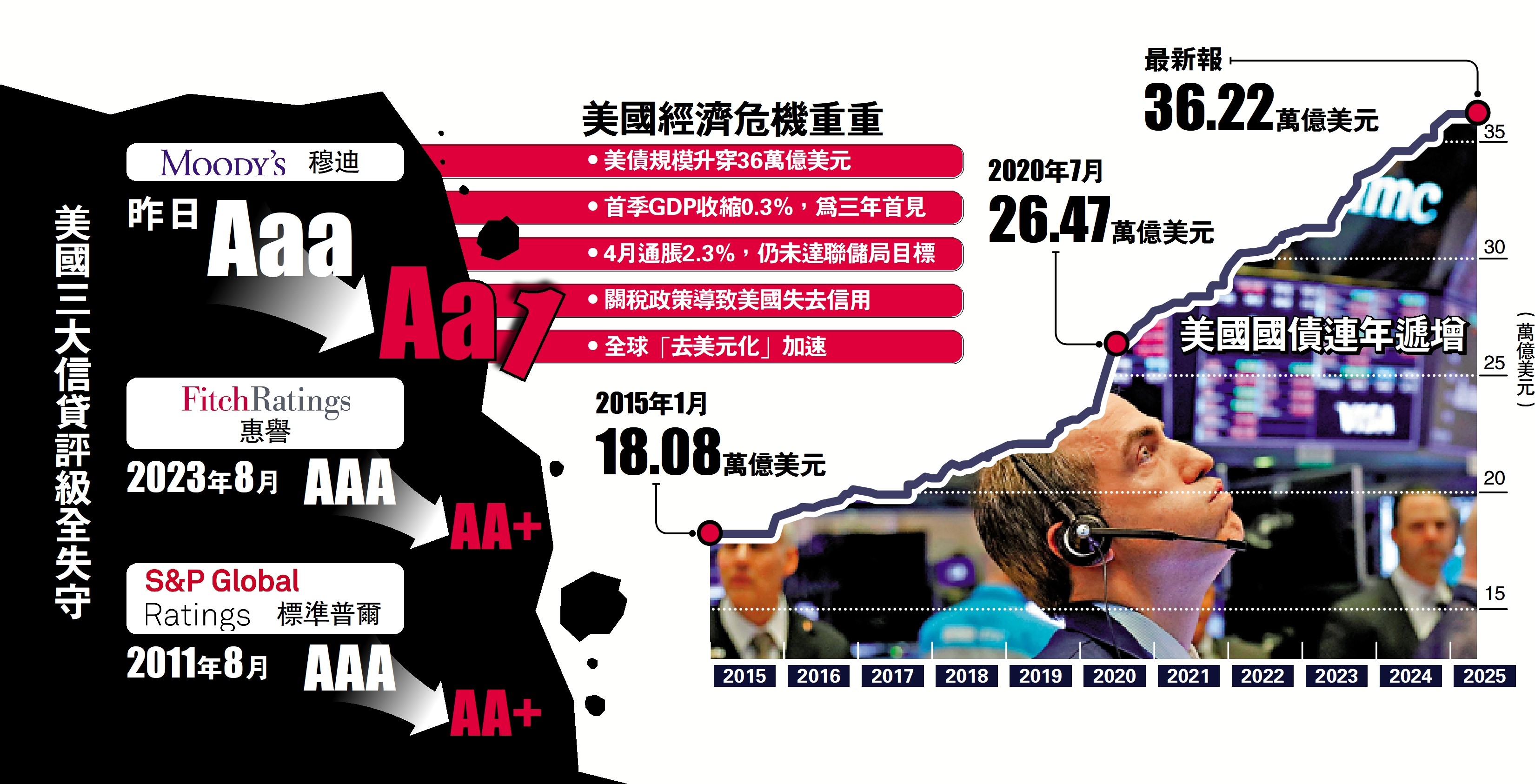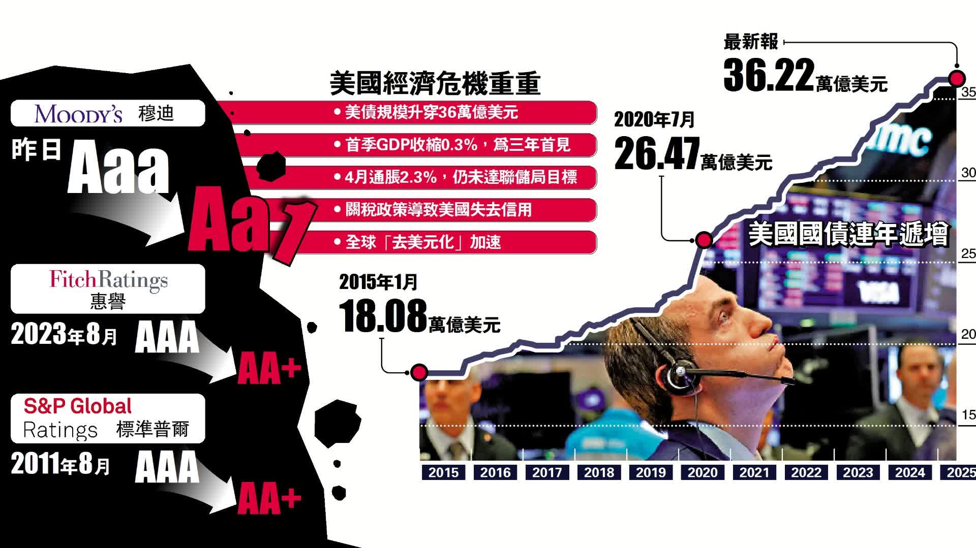 (大公報記者 李信)美國總統特朗普亂推關稅,損人害己的惡果陸續顯現:經濟倒退,財政加速惡化,債務急升,連美國評級機構穆迪亦將美國主權信用評級由「Aaa」下調至「Aa1」。該機構表示,美國財政紀律的持續缺失侵蝕傳統信用支柱。這是穆迪1919年給予美國最高評級以來首次降級,亦代表美國在三大評級機構中都失去最高的「3A」評級。