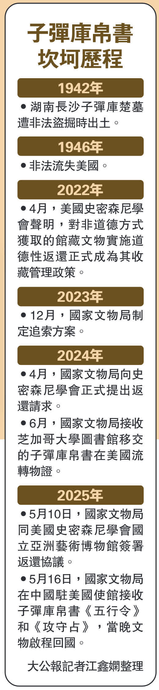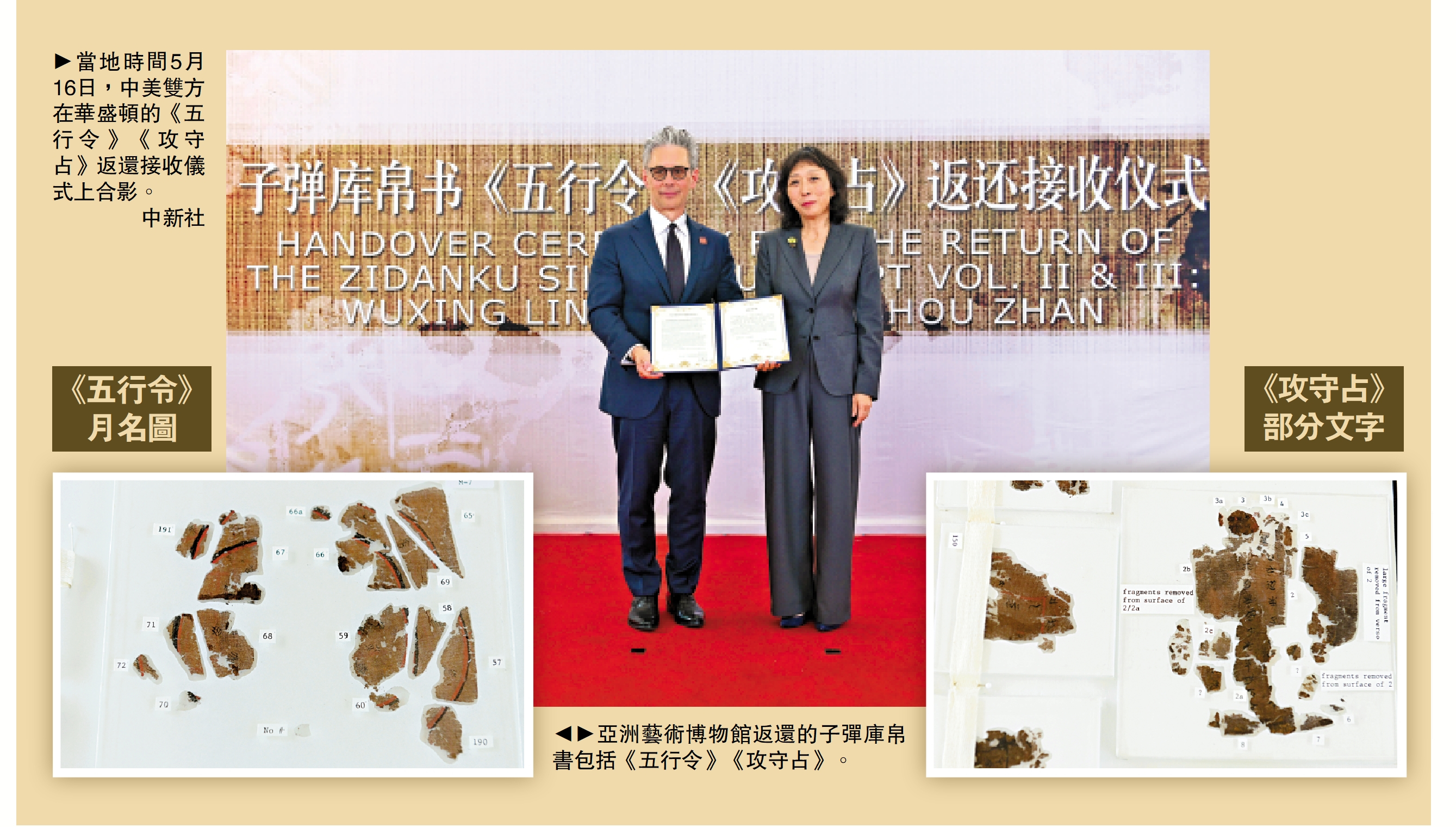 (大公報記者 江鑫嫻 北京報道)中國流失文物再傳回歸好消息。記者從國家文物局獲悉,當地時間5月16日,國家文物局在中國駐美國大使館接收美國史密森尼學會國立亞洲藝術博物館(以下簡稱亞洲藝術博物館)返還的子彈庫帛書《五行令》《攻守占》。當晚,文物完成裝箱,啟程回國。