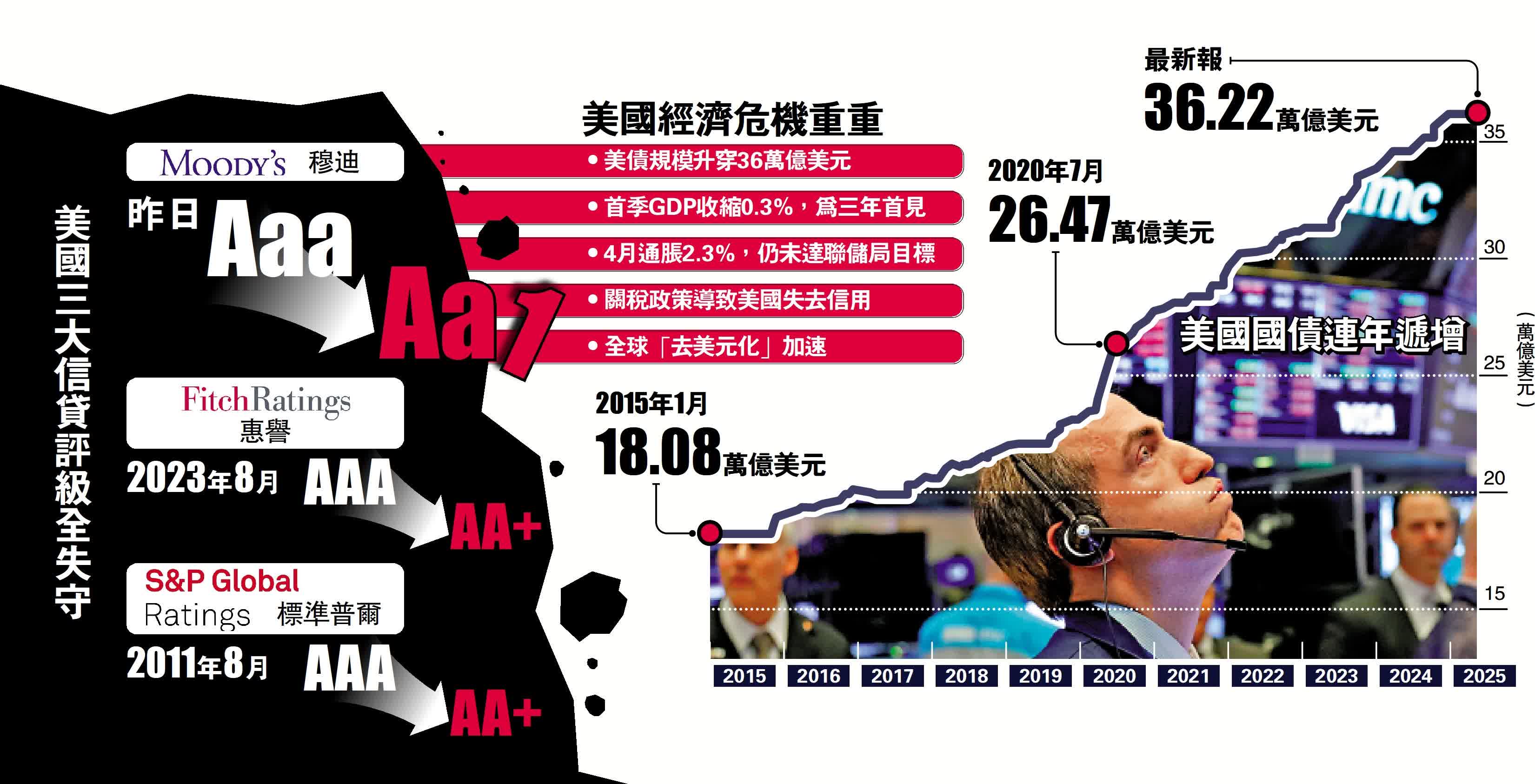 大公報報道。美國總統特朗普亂推關稅,損人害己的惡果陸續顯現:經濟倒退,財政加速惡化,債務急升,連美國評級機構穆迪亦將美國主權信用評級由「Aaa」下調至「Aa1」。該機構表示,美國財政紀律的持續缺失侵蝕傳統信用支柱。這是穆迪1919年給予美國最高評級以來首次降級,亦代表美國在三大評級機構中都失去最高的「3A」評級。點此閱讀詳情