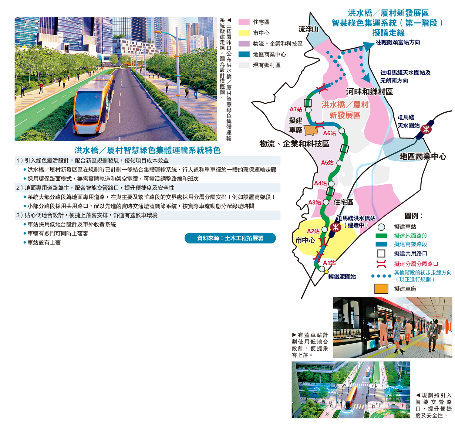 (大公報記者 易曉彤)北都發展以基建先行,就洪水橋/厦村及元朗南新發展區的智慧綠色集體運輸系統,政府將分為三階段推行。土木工程拓展署昨日公布走線規劃,包括首階段一號線的具體走線,由泥圍至洪水橋/厦村新發展區市中心、住宅區、物流、企業和科技區,長約4.5公里,擬設7個車站。系統採用環保路面模式,無需實體軌道和架空電纜,部分主要及繁忙路段的交界處會設高架段。