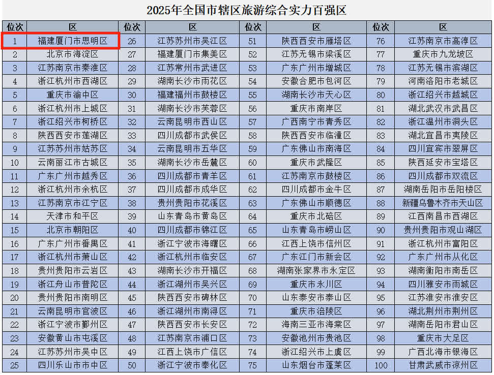 5月11日,以「打造文旅新品牌 滿足消費新需要」為主題的2025世界品牌莫干山大會·文旅系列活動在浙江省湖州市舉辦。活動期間,《全國市轄區旅遊研究報告2025》正式發布,2025年全國市轄區旅遊綜合實力百強區分布於21個省份,福建省廈門市思明區以全國第一上榜2025年全國市轄區旅遊綜合實力百強區。