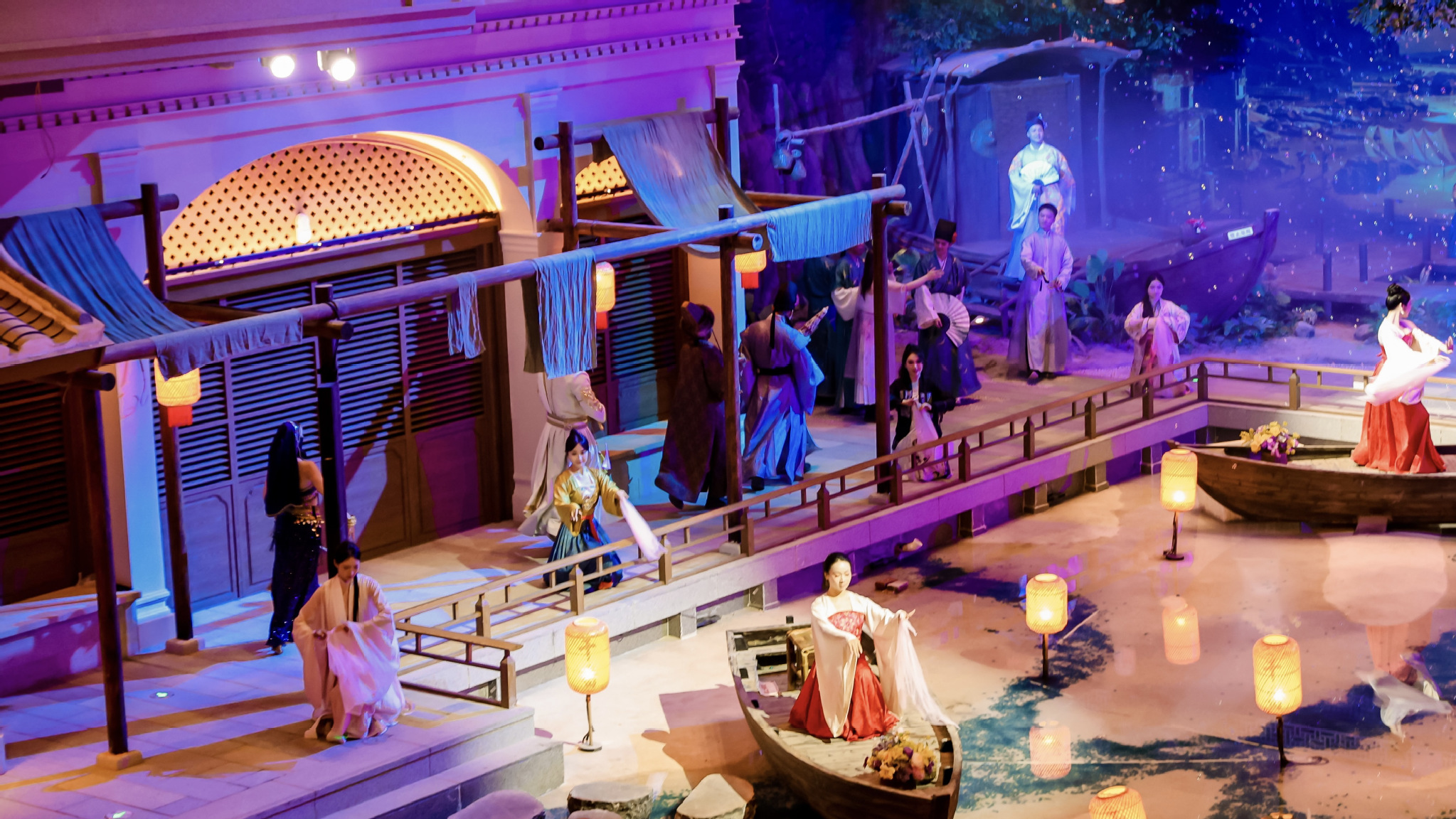 本次開業的一期「遠古山海」和「閩南幻境」,匠心濃縮遠古先民生活圖景和「宋韻閩南、海絲閩南、煙火閩南、南洋閩南」,呈現不同時空的人文、建築、景觀、業態、演藝、美食等多元魅力。徜徉於三大演區、八大街區,遊客還可觀賞近30場演藝、與44名演員互動、體驗超千款華服,找到屬於自己的閩南「一千零一頁」。