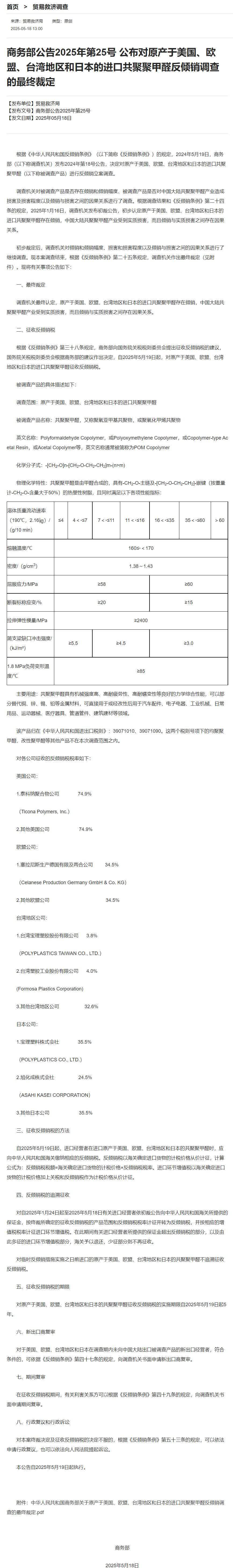 據商務部網站消息,根據《中華人民共和國反傾銷條例》(以下簡稱《反傾銷條例》)的規定,2024年5月19日,商務部(以下稱調查機關)發布2024年第18號公告,決定對原產於美國、歐盟、台灣地區和日本的進口共聚聚甲醛(以下稱被調查產品)進行反傾銷立案調查。