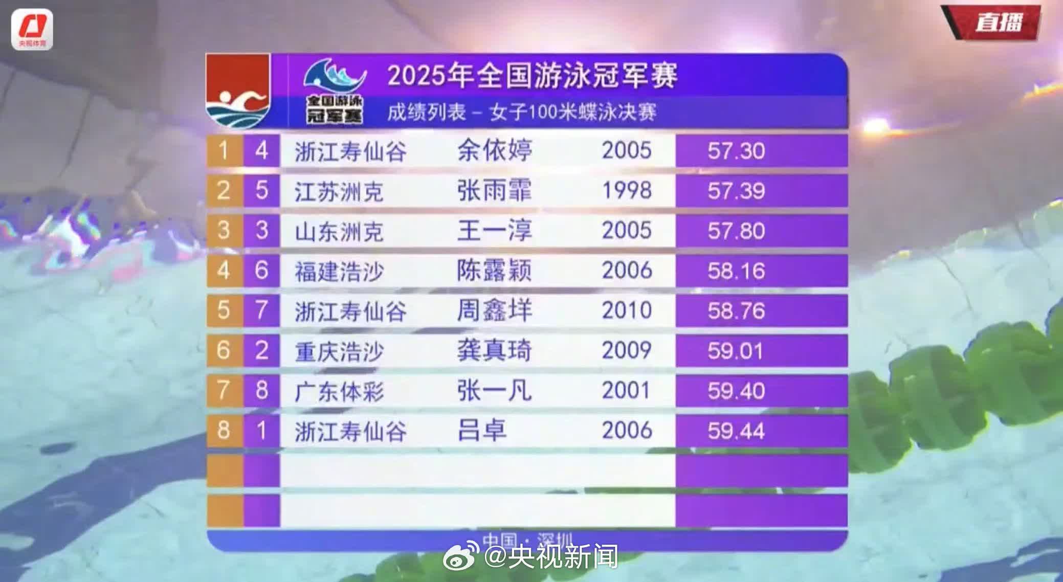 大公文匯網報道,今天(18日),在2025年全國游泳冠軍賽女子100米蝶泳決賽中,餘依婷以57秒30的成績,奪得冠軍;張雨霏以57秒39的成績,收穫亞軍;王一淳遊出57秒80,獲得季軍。點讚祝賀!