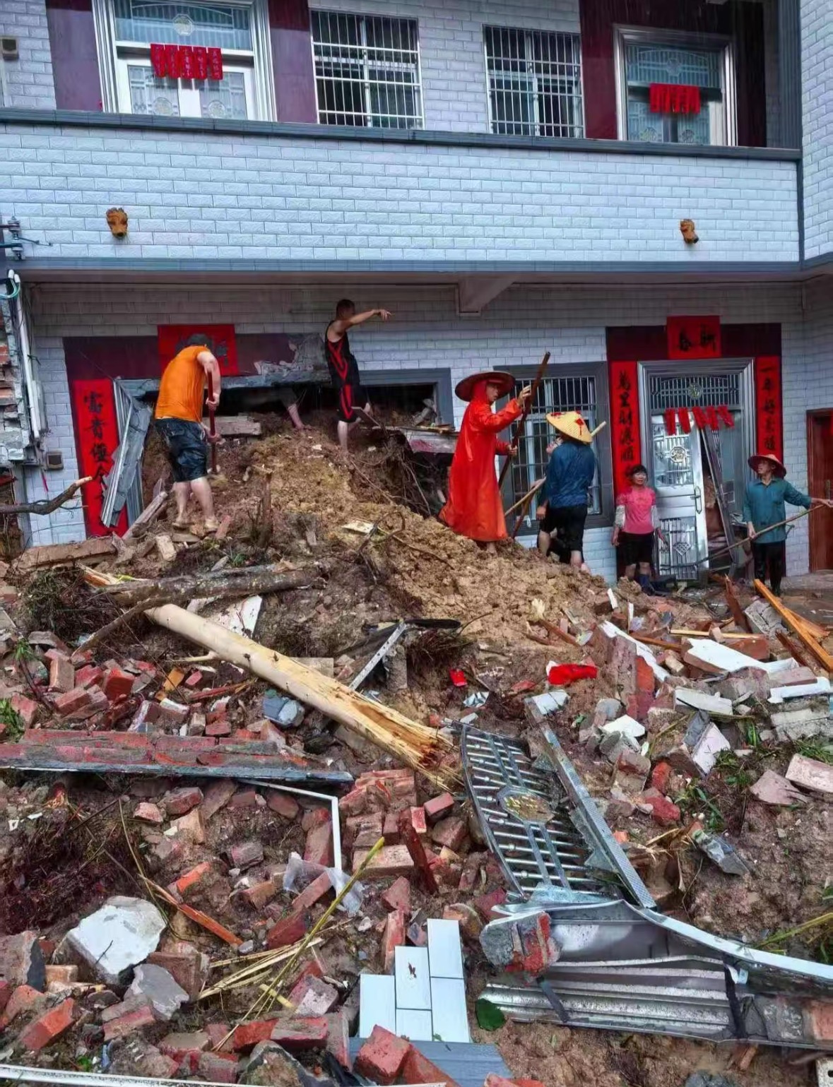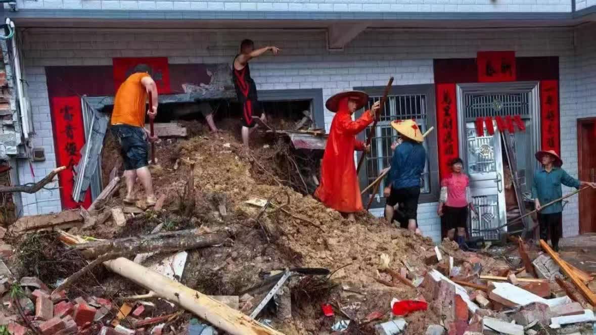滑坡發生後,當地應急、公安、消防、衞健等多部門第一時間趕赴現場。社交平台上傳出的現場視頻顯示,一座房屋倒塌嚴重,現場堆滿泥沙、防護網、防盜鐵門、鐵皮、瓷磚等雜物,救援車輛和挖掘機正在清理通道,多名身穿橙色消防服的人員不間斷作業,搜救一刻未停。