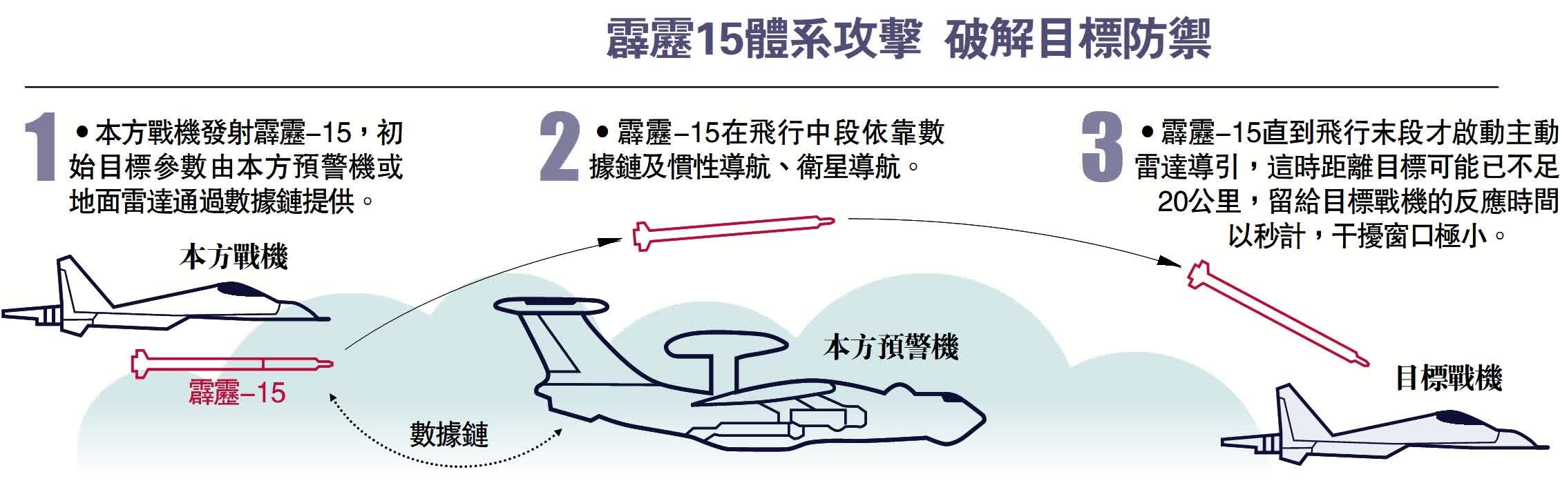 霹靂-15採用雙脈衝發動機,射程300公里,速度可達4馬赫。在預警機數據鏈引導下,霹靂-15可在主動雷達關閉下發動超視距攻擊,避過目標防護系統探測,到靠近時才打開主動雷達、二次點火,高速精準突防,使目標避無可避。