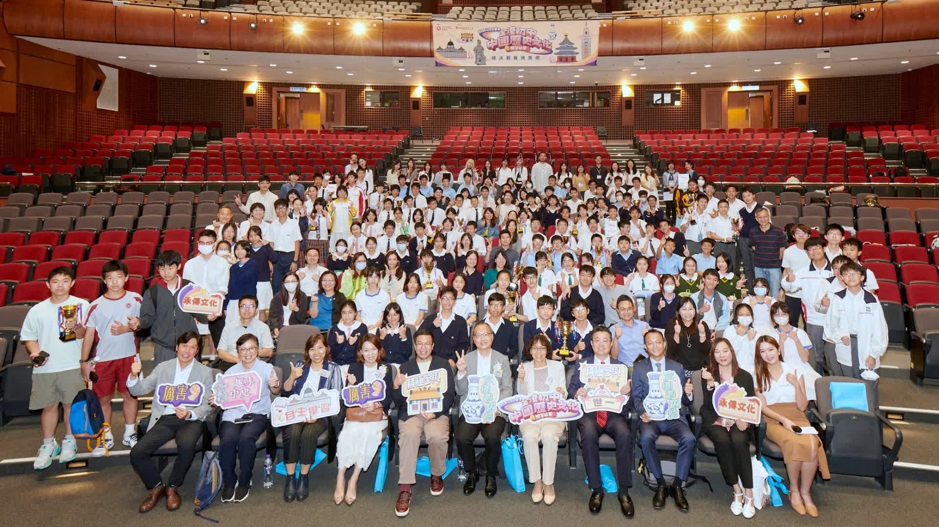Organised by the Education Bureau (EDB) of the HKSAR Government, with the support from the Hong Kong and South China Historical Research Programme (HKSCHRP) of Lingnan University, the 2024/25 Territory-wide Junior Secondary Chinese History and Culture Quiz Final and Prize Presentation Ceremony was held at the Chan Tak Tai Auditorium of Lingnan University today, 17 May. The 12 finalist teams were selected from over 22,000 students from more than 145 secondary schools across Hong Kong. The number of participants has increased by 38% over the 16,000 who took part in last year's inaugural event, which highlights the competition’s success in stimulating interest in Chinese history and culture in young people as well as the Government's achievement in promoting patriotic education.