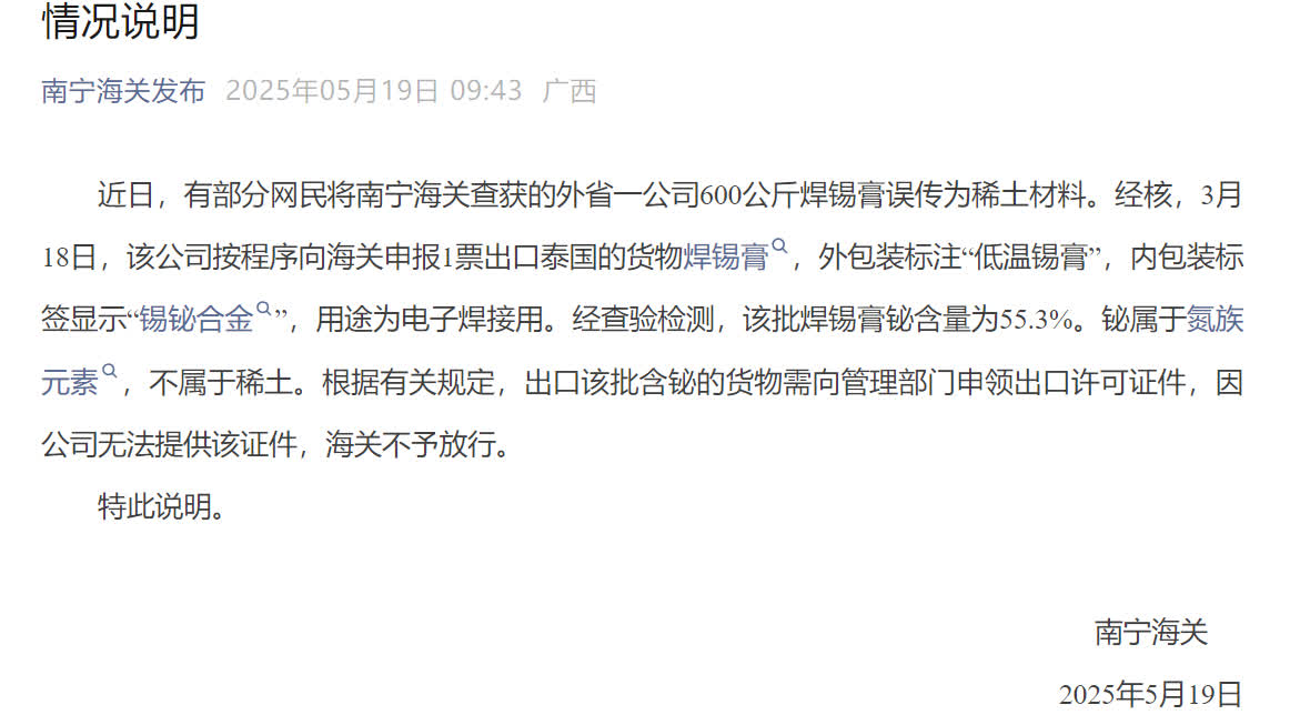 近日,「稀土內鬼浮出水面,南寧海關立大功」等信息在網絡流傳,引發廣泛關注,對此,南寧海關表示,該事件是部分網民將該關查獲的外省一公司600公斤焊錫膏誤傳為稀土材料。