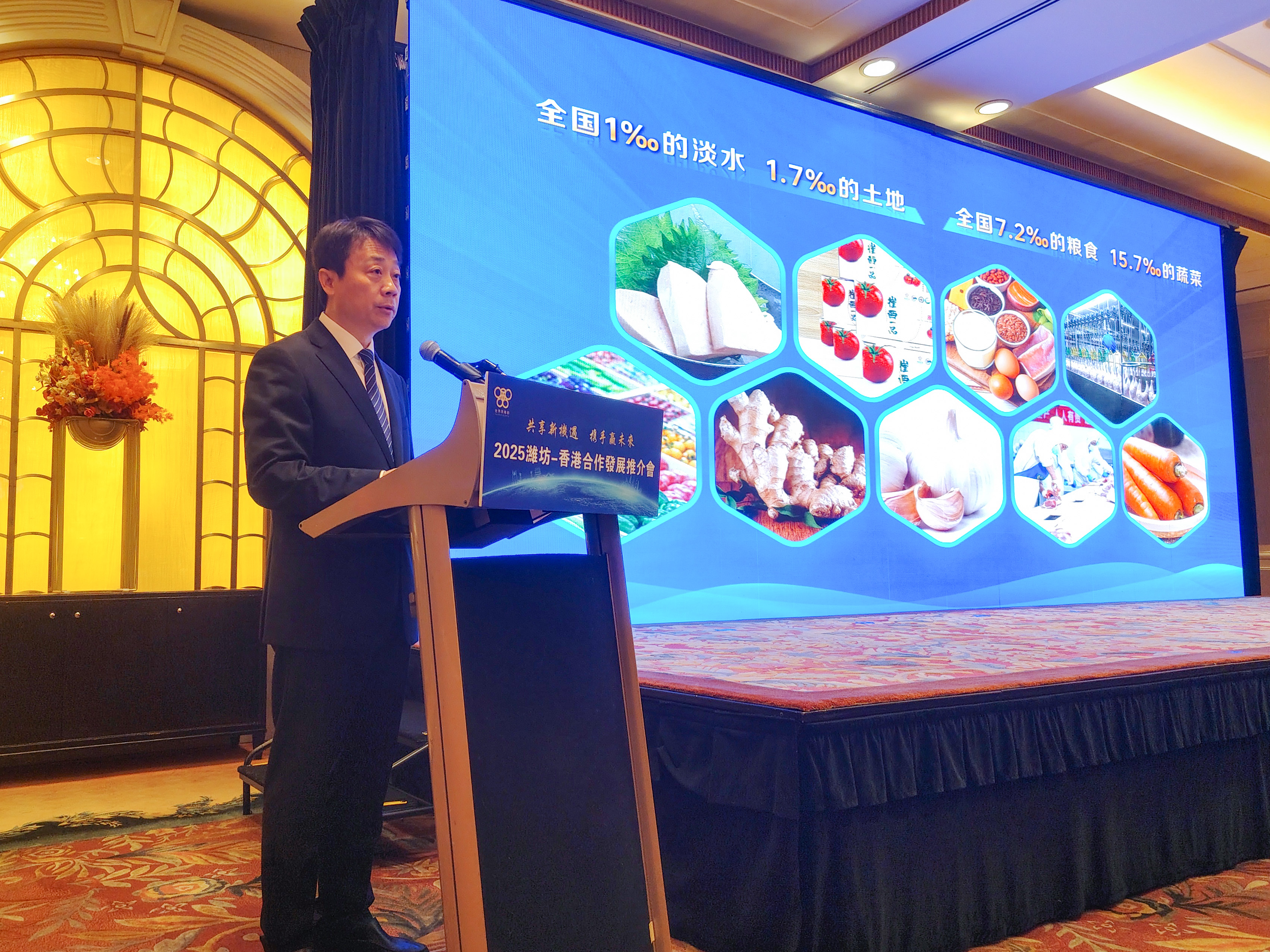 濰坊市商務局黨組書記、局長郭永超作開放合作專題推介,對濰坊兩個國家級對外開放平台——農業開放發展綜合試驗區和國家跨境電商綜合試驗區進行了重點推介。農業開放發展綜合試驗區是首個以農業為特色的國家對外開放綜合實驗區,涵蓋了濰坊全域,已經成為全國農業開放發展的引領區、農業科技創新的先行區、農村一二三產業融合的發展示範區。濰坊期待未來能在現代農業、食品、農產品等領域深化與港澳合作。國家跨境電商綜合實驗區於2020年獲批,帶動了濰坊跨境電商進出口額,由當年的2000萬美元發展到2024年的30億美元。濰坊市將以最優的營商環境和最大的支持力度服務跨境貿易的發展。