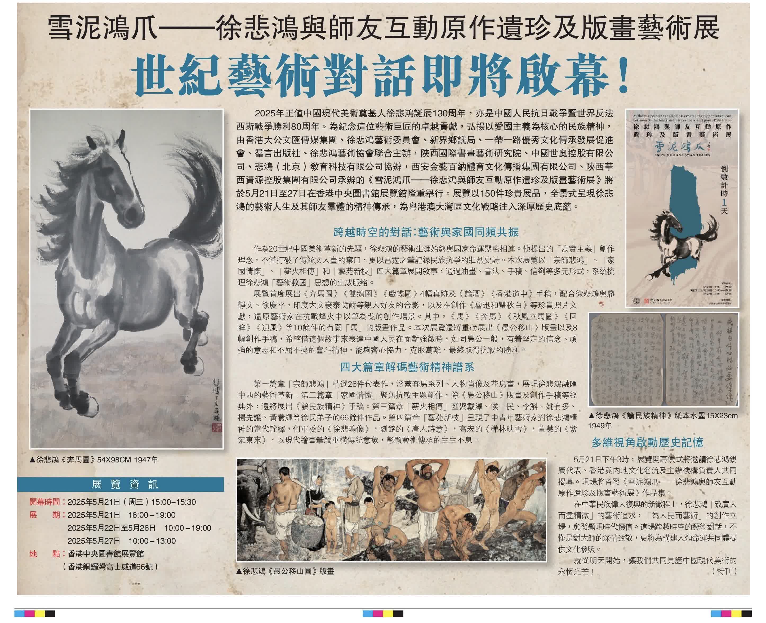 5月21日下午3時,展覽開幕儀式將邀請徐悲鴻親屬代表、香港與內地文化名流及主辦機構負責人共同揭幕。現場將首發《雪泥鴻爪——徐悲鴻與師友互動原作遺珍及版畫藝術展》作品集。