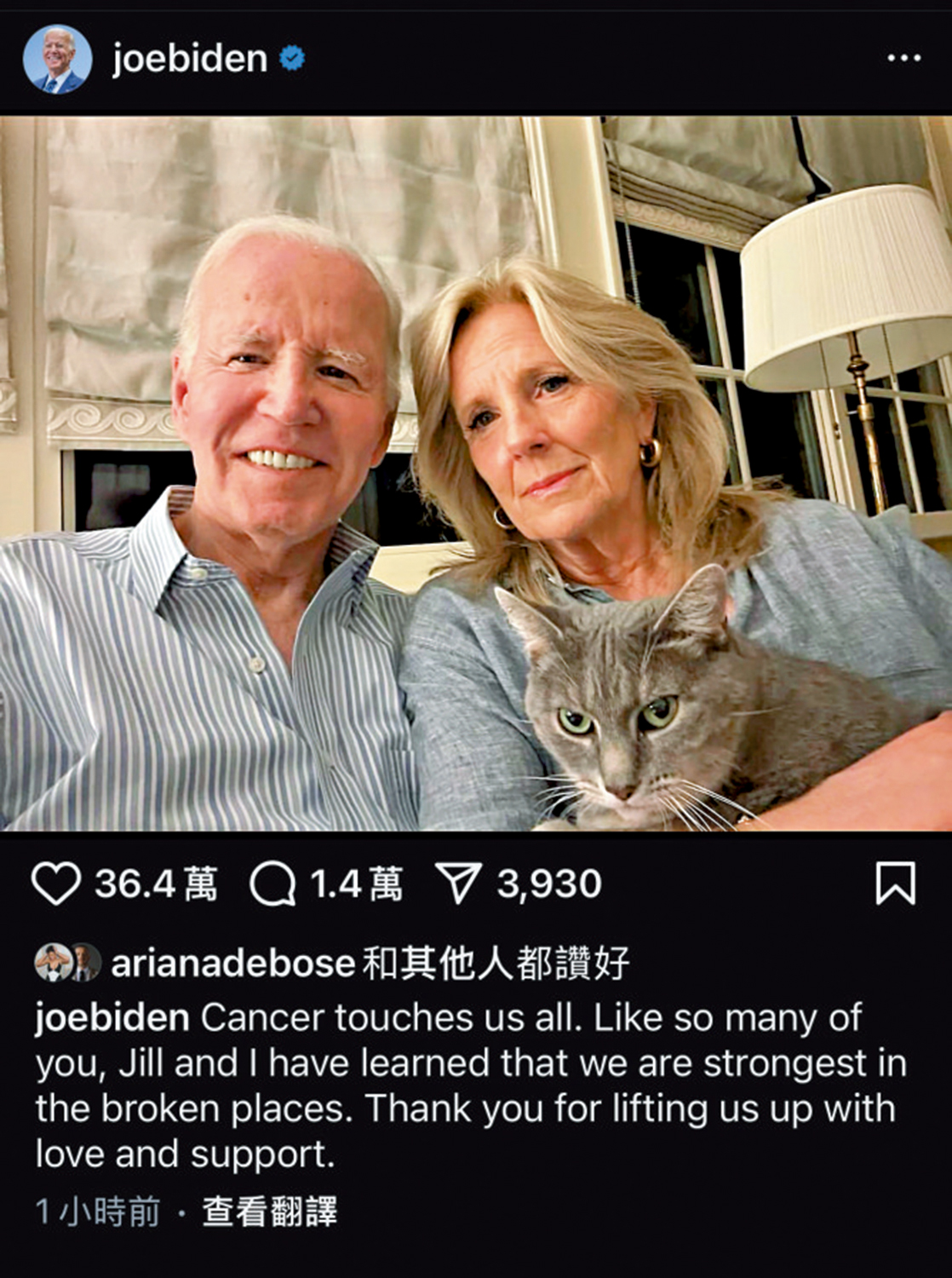 拜登19日在社交平台發布一張與妻子吉爾的自拍照,感謝外界的關心與支持,「癌症影響着我們每一個人,和你們中的許多人一樣,吉爾和我都明白,我們會在受傷的地方變得更堅強」。