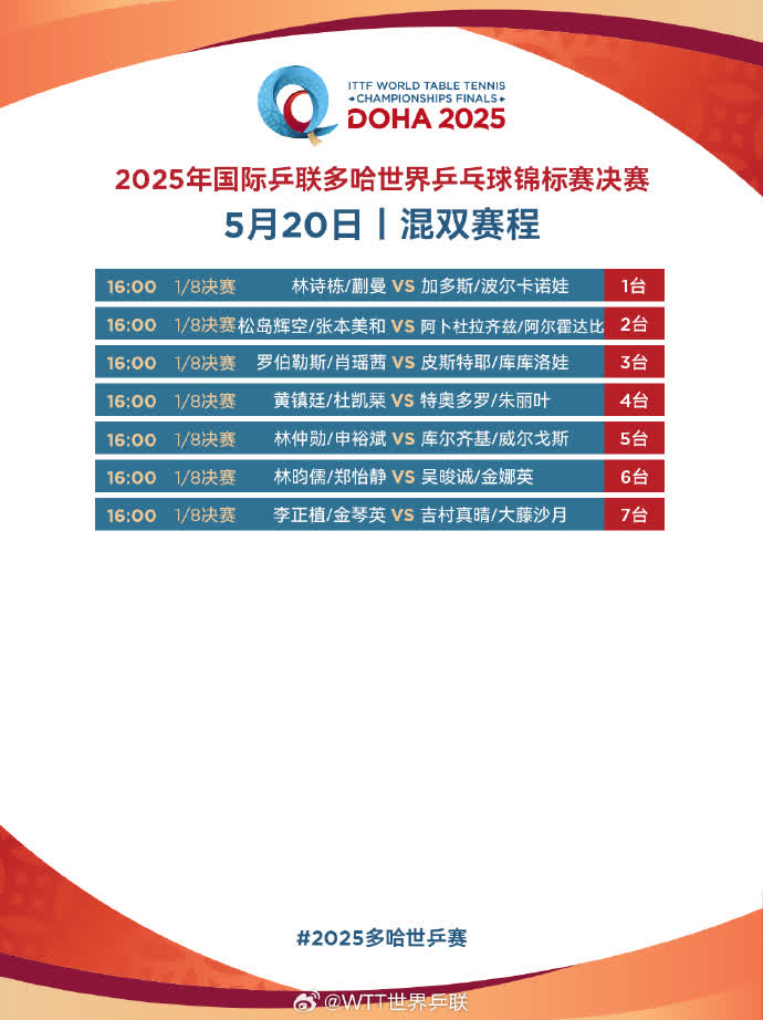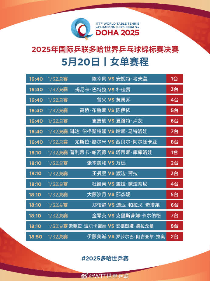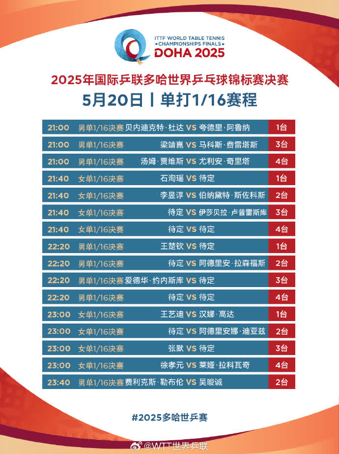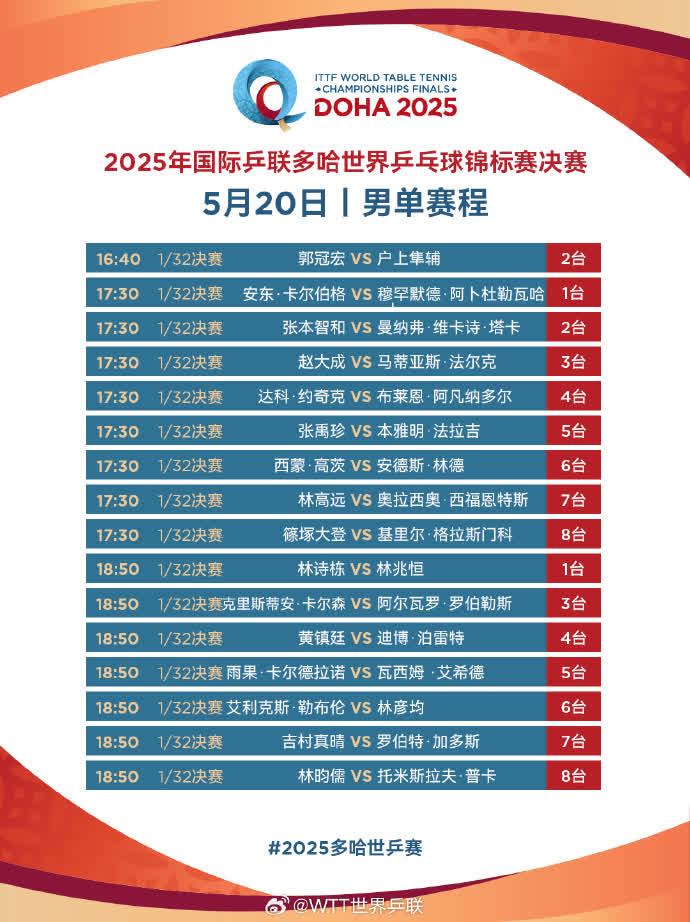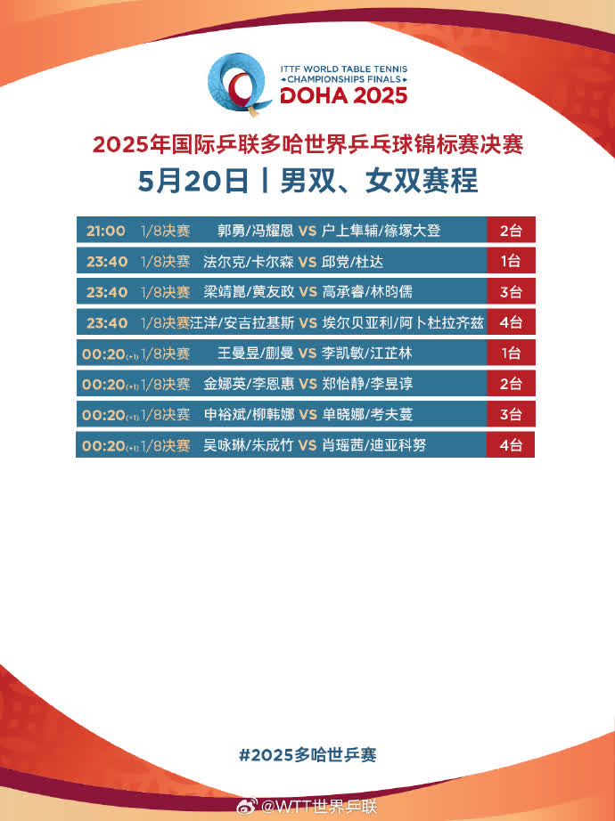 大公文匯網報道,今天(5月20日),多哈世乒賽迎來第四個比賽日,中國軍團將在男雙、女雙、男女單打等多條戰線全面出擊,梁靖崑、王曼昱一天2戰,梁靖崑/黃友政、王曼昱/蒯曼衝擊雙打8強。港隊方面,黃鎮廷、杜凱琹在16:00衝8強,隨後,兩人分別衝男女單打32強。