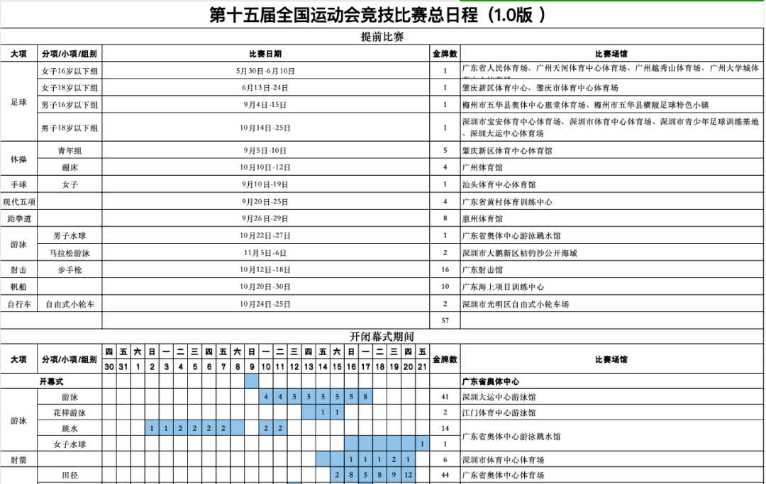 大公文匯網報道,5月19日,國家體育總局競技體育司公布第十五屆全國運動會競技比賽總日程(1.0版)。