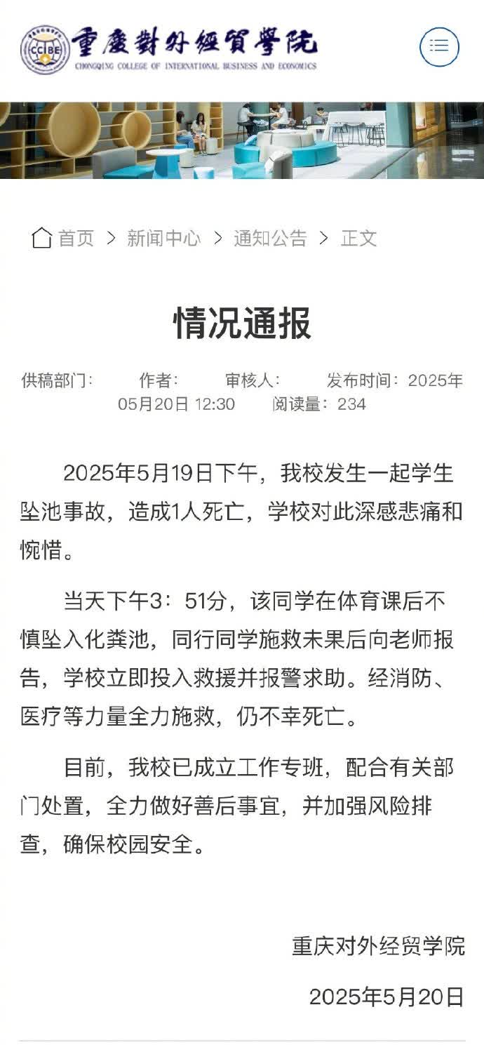 大公文匯網報道,5月20日中午,重慶對外經貿學院通報:2025年5月19日下午,我校發生一起學生墜池事故,造成1人死亡,學校對此深感悲痛和惋惜。當天下午3:51分,該同學在體育課後不慎墜入化糞池,同行同學施救未果後向老師報告,學校立即投入救援並報警求助。經消防、醫療等力量全力施救,仍不幸死亡。目前,我校已成立工作專班,配合有關部門處置,全力做好善後事宜,並加強風險排查,確保校園安全。