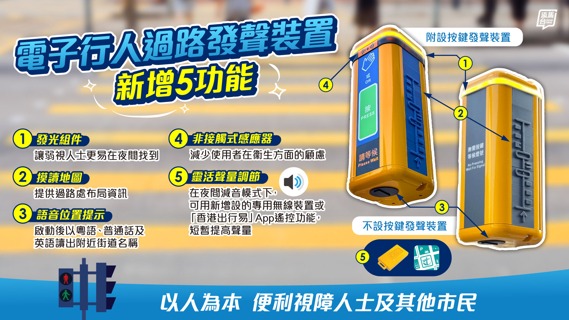 全港行人過路處的電子行人過路發聲裝置正逐步更新,加入以人為本的新功能,便利視障人士及其他市民,有助提升香港作為無障礙城市的道路安全體驗。看圖了解增設的5項新功能。