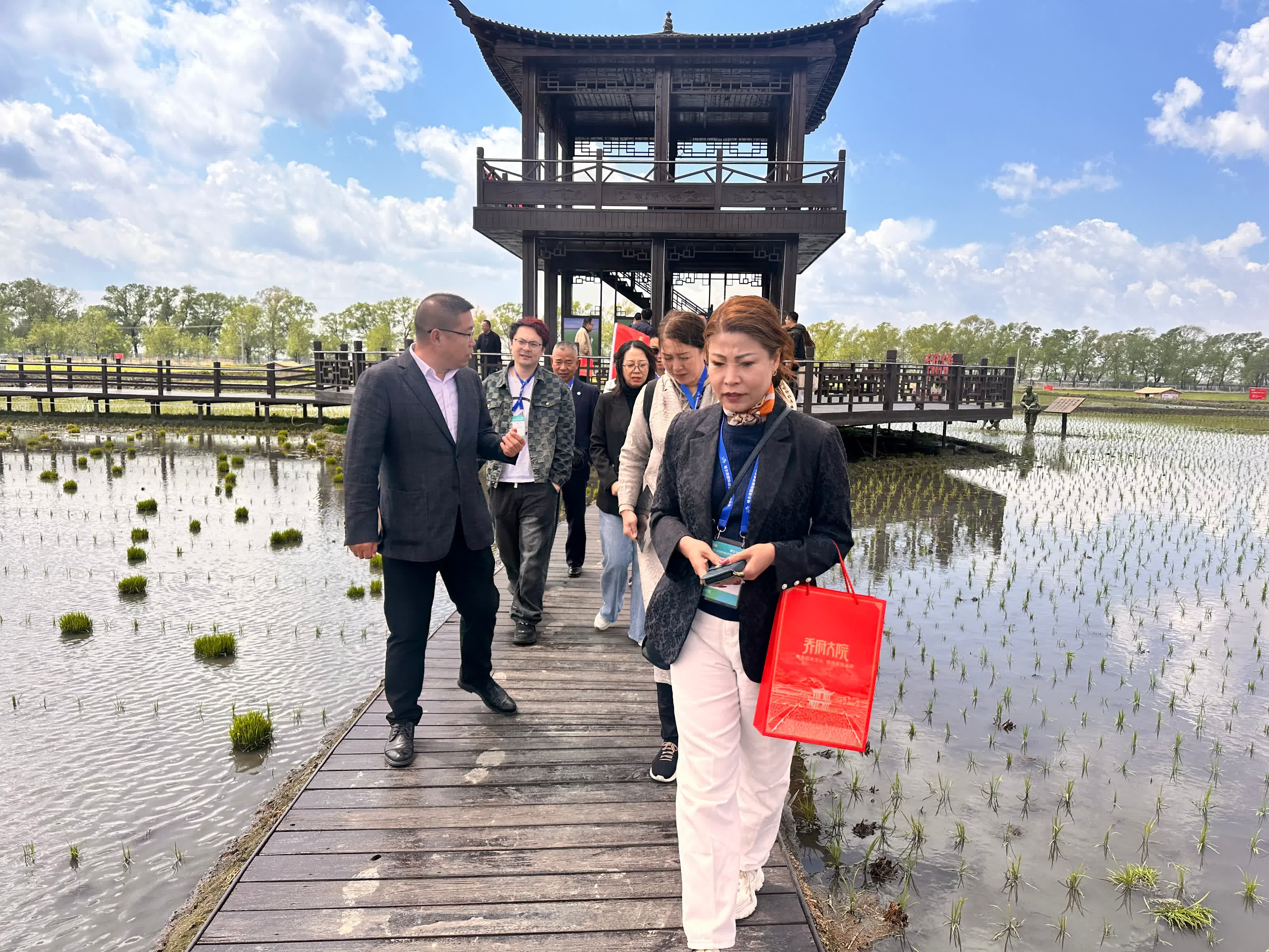 在喬府大院農業股份有限公司稻鄉小鎮,嘉賓參加了農耕文化體驗,通過觀看全息投影及實物展陳,深入了解五常大米從唐代「盧城之稻」到現代「地理標誌產品」的千年傳承,以及智能工廠從育苗、插秧到加工的全產業鏈科技實力。嘉賓感嘆「五常大米」嚴苛的加工標準,感受「每一粒米都是科技與自然的結晶」。暢遊「中國最美田園」現代農業示範區,自然生態和諧的田園景觀和定製農業互動項目,吸引嘉賓紛紛表示,希望在這裏認領「一畝田」,享受優質稻米帶來的健康生活。僑商感慨道,「早就知道五常大米揚名海內外,這次參觀考察,親眼看到五常大米從黑土地到餐桌的優質品質,沁人心脾的米香令人讚嘆。還有山野乾貨和特色糧油,滿滿都是地域風味。這裏得天獨厚的自然條件與豐富物產,蘊藏着無限商機,我期待下一步能與五常在現代農業和農副食品深加工方面尋求合作機會。」