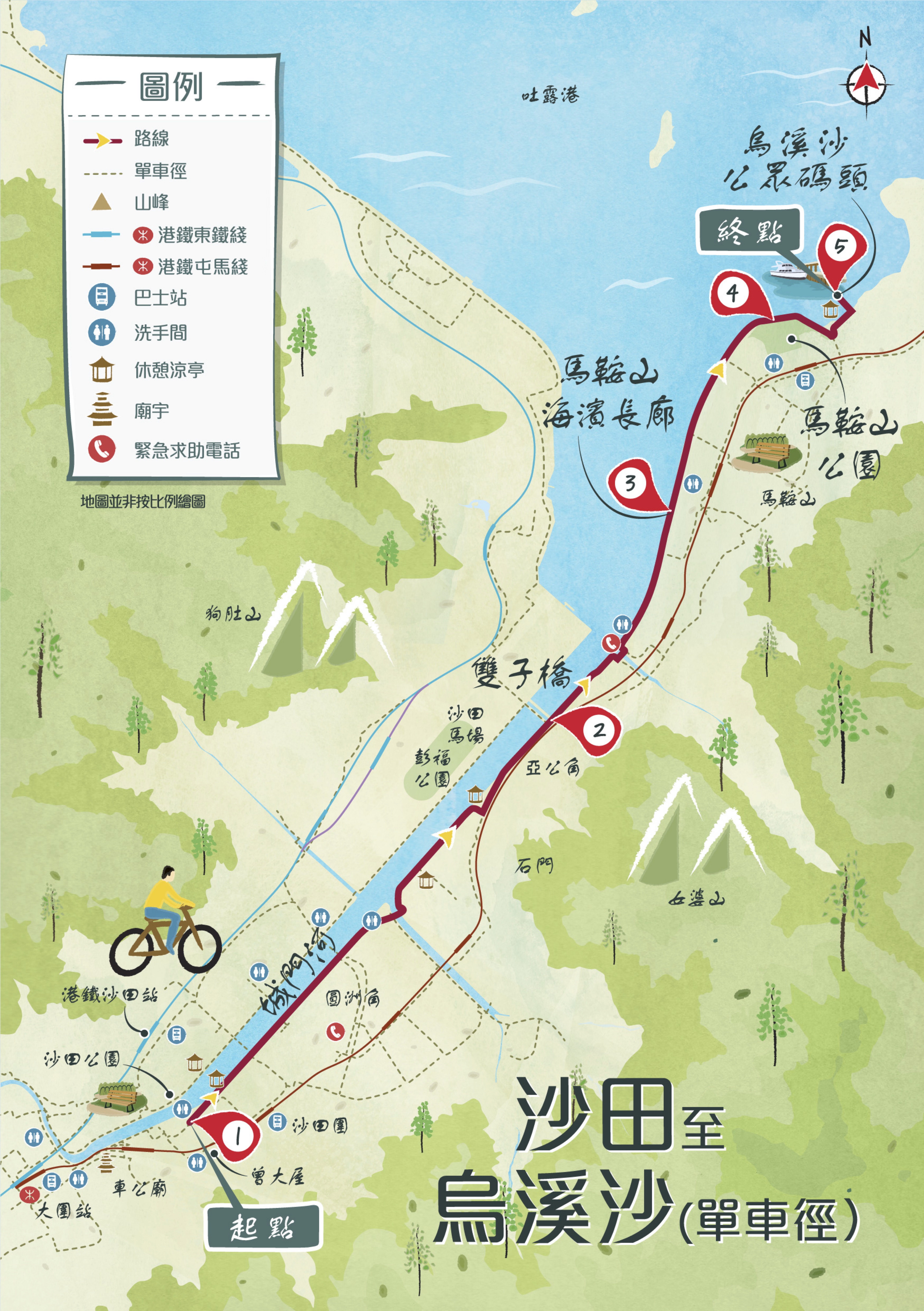 - 騎行路線2:大圍站/沙田站—雙子橋—馬鞍山海濱長廊—馬鞍山公園—烏溪沙公眾碼頭。全長約8公里,行程不超過2小時