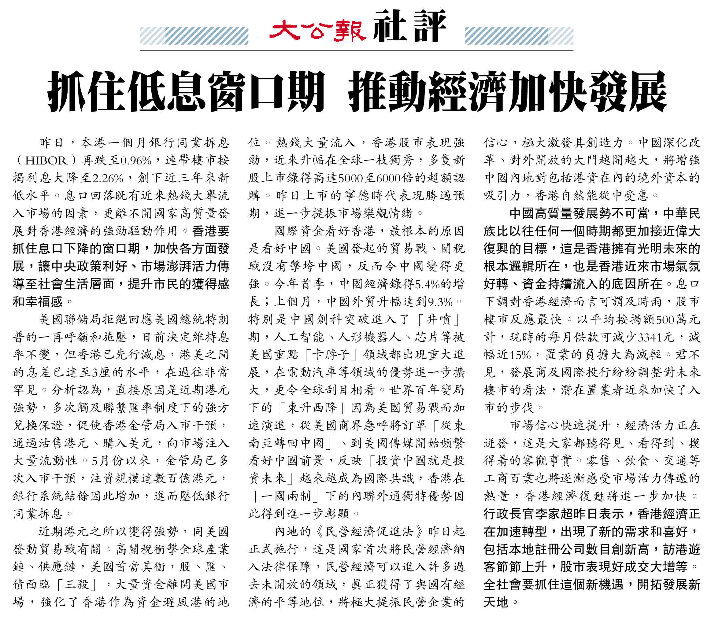 昨日,本港一個月銀行同業拆息(HIBOR)再跌至0.96%,連帶樓市按揭利息大降至2.26%,創下近三年來新低水平。息口回落既有近來熱錢大舉流入市場的因素,更離不開國家高質量發展對香港經濟的強勁驅動作用。香港要抓住息口下降的窗口期,加快各方面發展,讓中央政策利好、市場澎湃活力傳導至社會生活層面,提升市民的獲得感和幸福感。