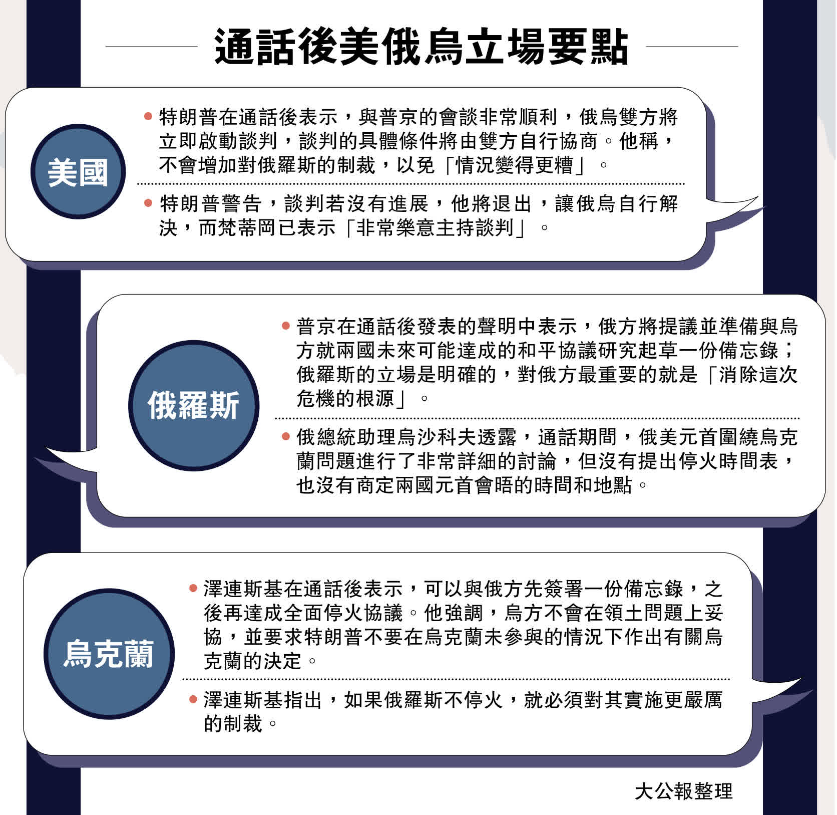 大公報綜合報道,當地時間19日,美國總統特朗普與俄羅斯總統普京、烏克蘭總統澤連斯基分別通電話,商討俄烏停火談判等問題。特朗普在通話後表示,俄烏將立即啟動談判。普京稱,俄方將就俄烏可能達成的和平協議起草一份備忘錄。澤連斯基則強調,烏方不會在領土問題上妥協。分析指,此次通話並未釋放出談判可能取得重大突破的信號,俄烏分歧依舊明顯,而特朗普「斡旋」遲遲未見成效,試圖「抽身」的意圖愈發明顯。