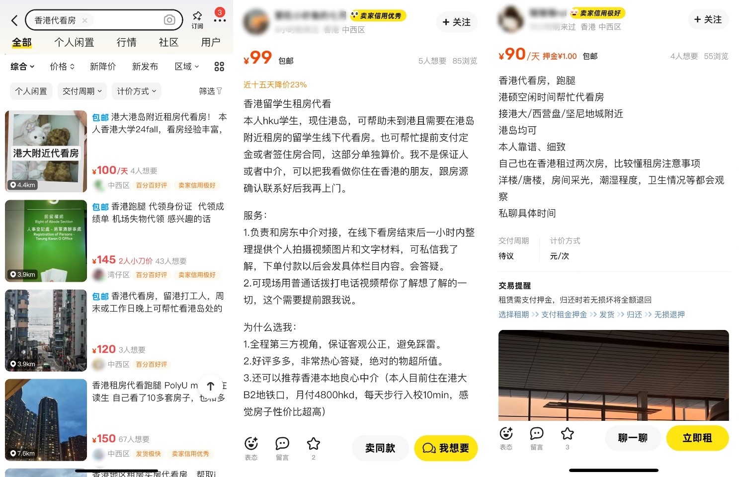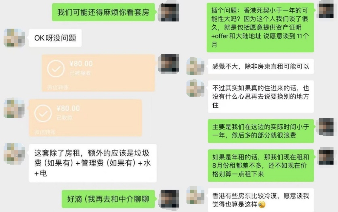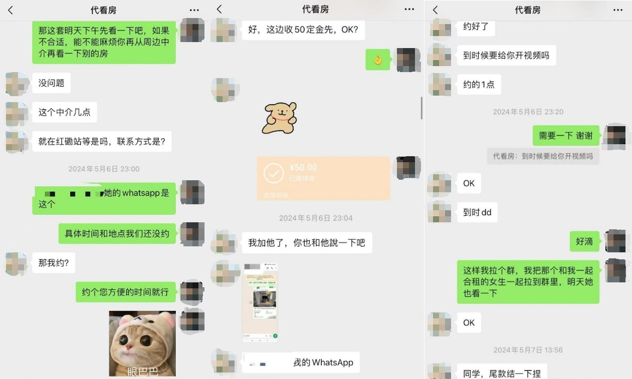 「我們當時在『小紅書』上找了兩家,他們在帖子寫着自己是港碩學生和一些基本情況,能幫忙代看房。」印同學說,和代看人通常以微信聯繫,自己先提供房子信息,代看人進行報價,「付了定金後,他會主動和中介或者房東聯繫,約定時間去看房。」