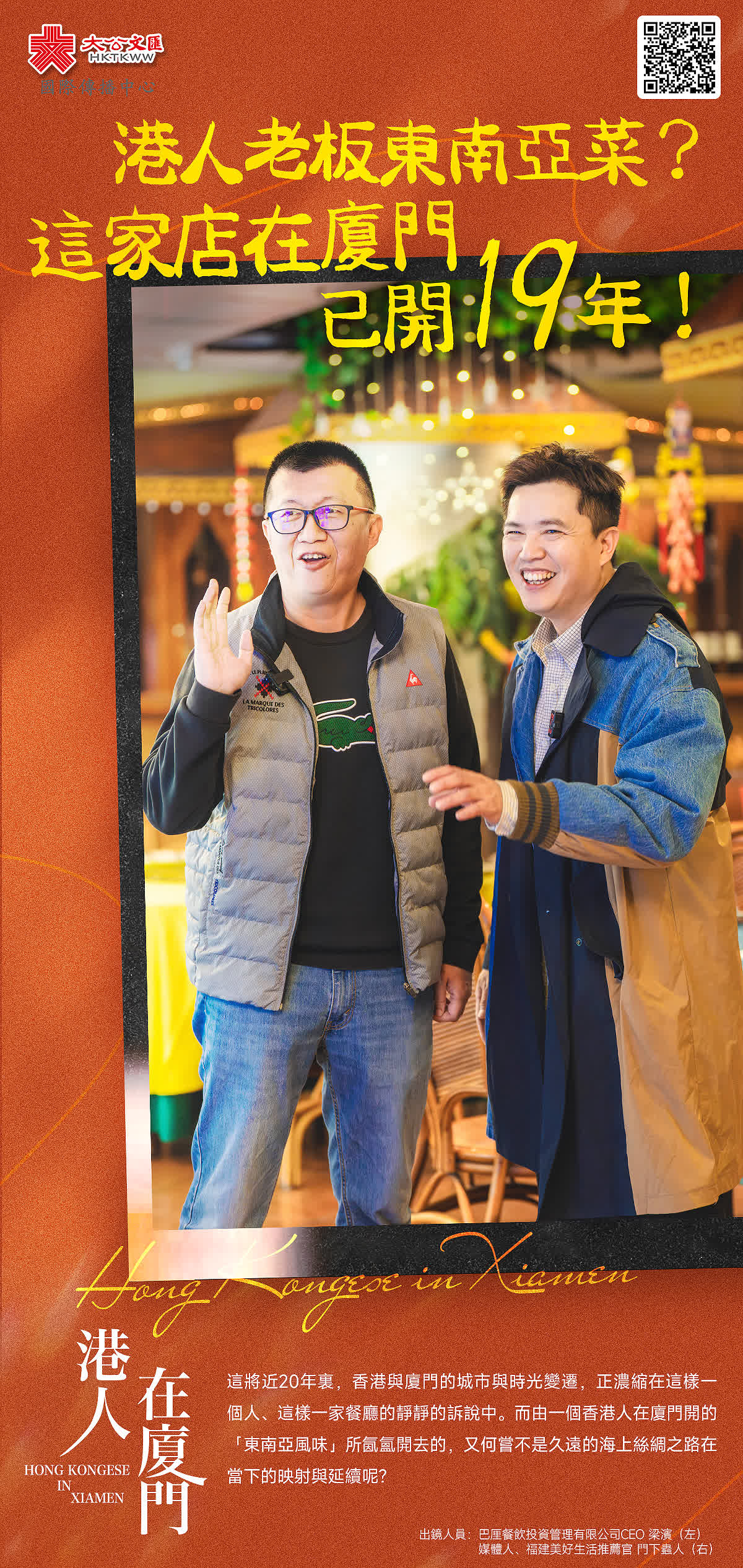 或許,真正的長期主義,是一種從傳承到生活、從堅守到融合的人生與事業「系統」。將近20年裏,香港與廈門的城市與時光變遷,正濃縮在這樣一個人、這樣一家餐廳的靜靜訴說中。而由一個香港人在廈門開的「東南亞風味」所氤氳開去的,又何嘗不是久遠的海上絲綢之路在當下的映射與延續呢?