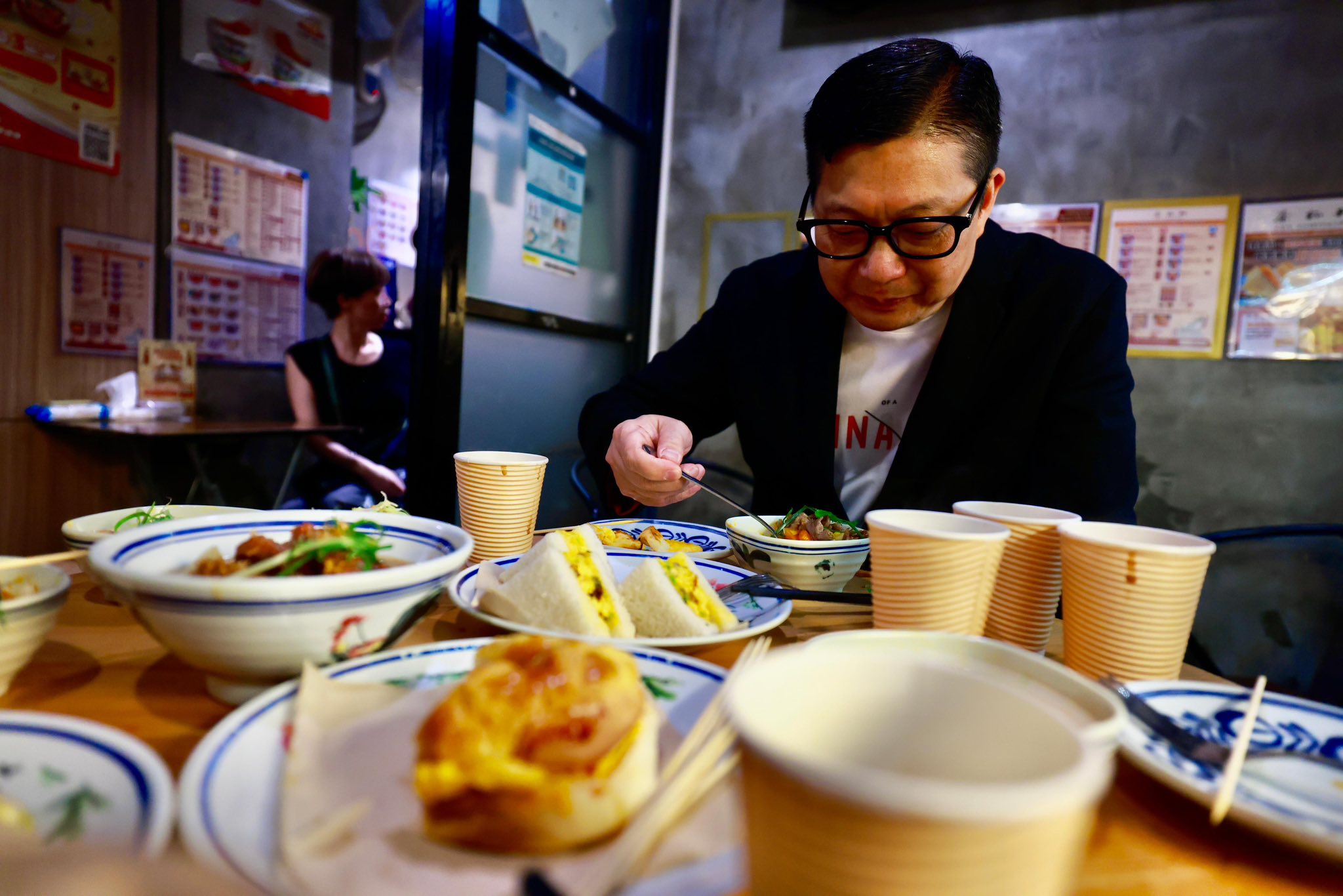 鄧炳強指,早前周末到灣仔工作,於是趁機早起去一間春園街茶餐廳食早餐。他大讚該店招牌奶茶出色,芫茜皮蛋鹹蛋滑蛋三文治「更有驚喜」。其間,鄧炳強更獲老闆「親傳」教沖奶茶,相片可見他一臉認真撞茶,惟疑似功夫不到家將茶沖灑。他終「決定獻醜不如藏拙」,「自己都係較適合坐定定品嘗美食」。