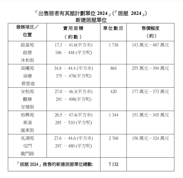 - 五個位於啟德、油塘、觀塘、屯門及東涌的新建居屋發展項目,合共提供7132個單位;