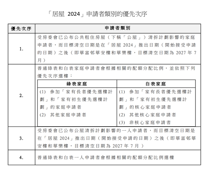 合資格申請者選樓的優先次序將按申請類別、配額比例和攪珠結果釐定。房委會在今期居屋起落實在2023年施政報告宣布的「家有初生優先選樓計劃」,為參加「家有長者優先選樓計劃」及新增「家有初生優先選樓計劃」的家庭申請者設定2,900個單位的配額;此外,房委會會為一人申請者預留700個單位的配額。