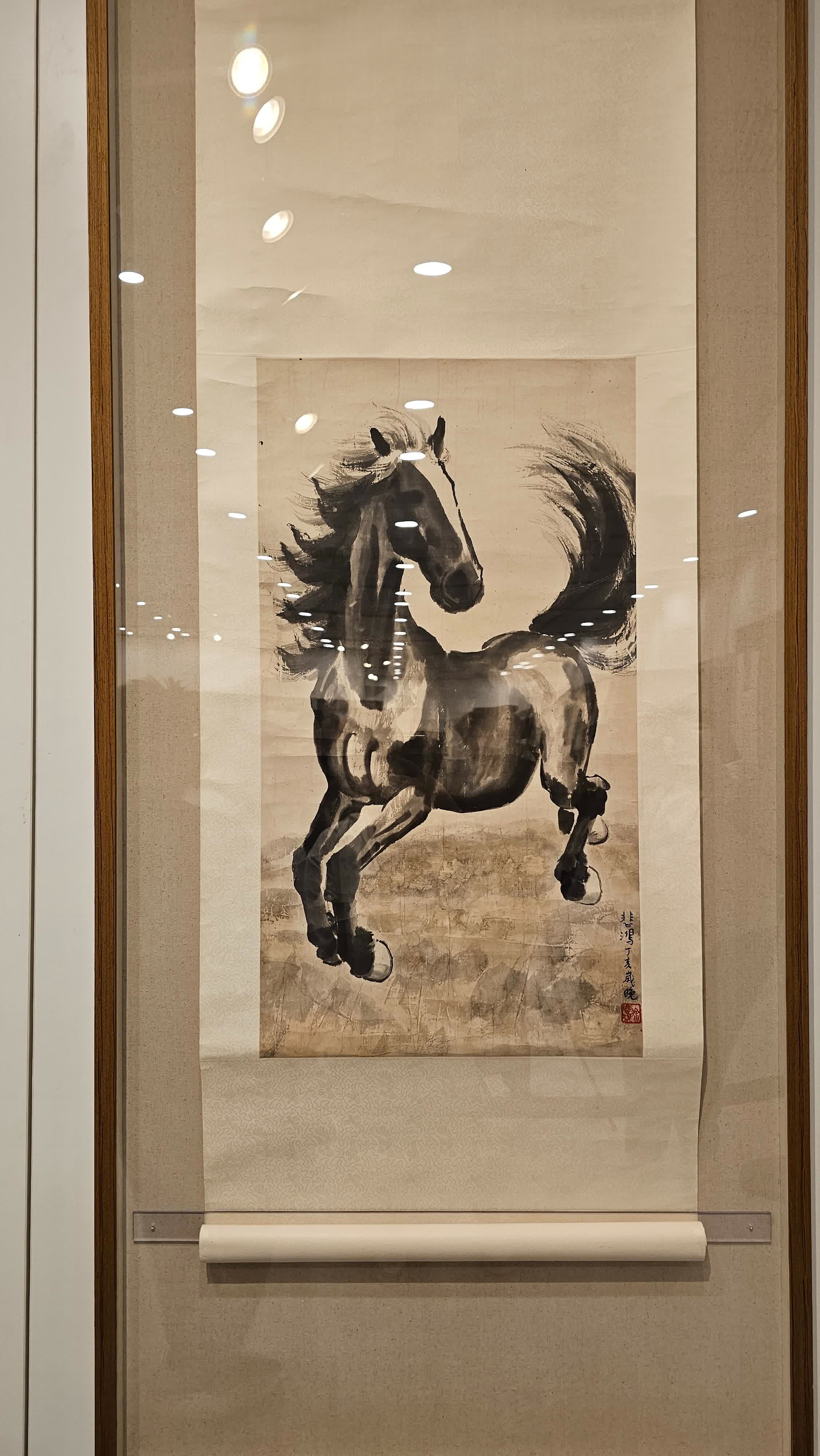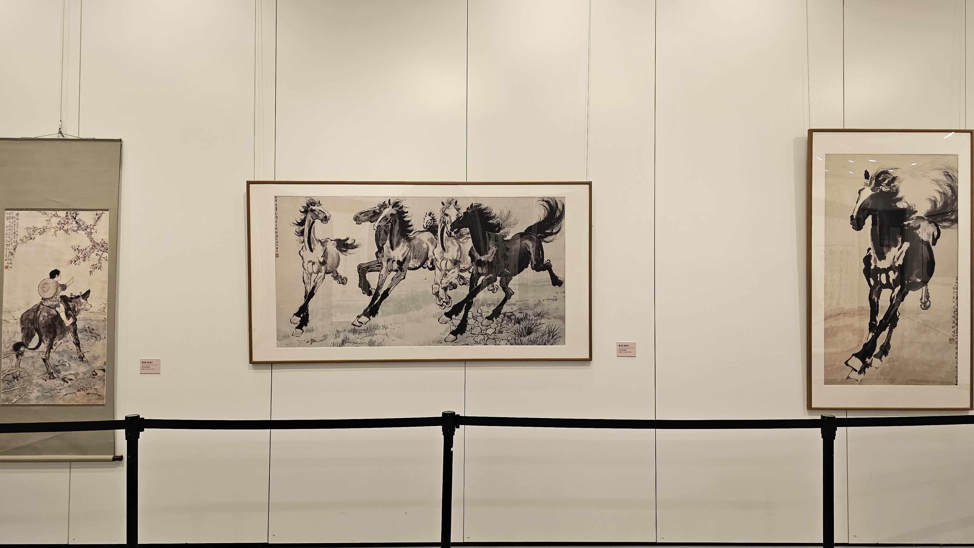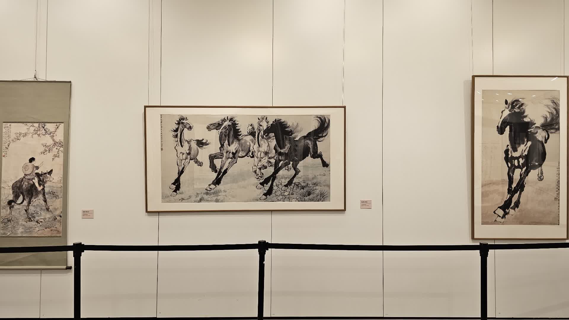 除了版畫《愚公移山》以及8幅創作手稿,現場還展出多幅徐悲鴻震撼人心的創作「馬」,包括他1947年創作的《奔馬圖》,畫面中駿馬逆風疾馳,鬃毛如烈焰飛舞,馬蹄踏破虛空,將抗戰時期國人渴求勝利的心境化作視覺史詩,體現其個人藝術追求與民族命運緊密相連的創作觀,展現其作品超越傳統文人畫的寄情言志、昇華為時代集體吶喊的精神。