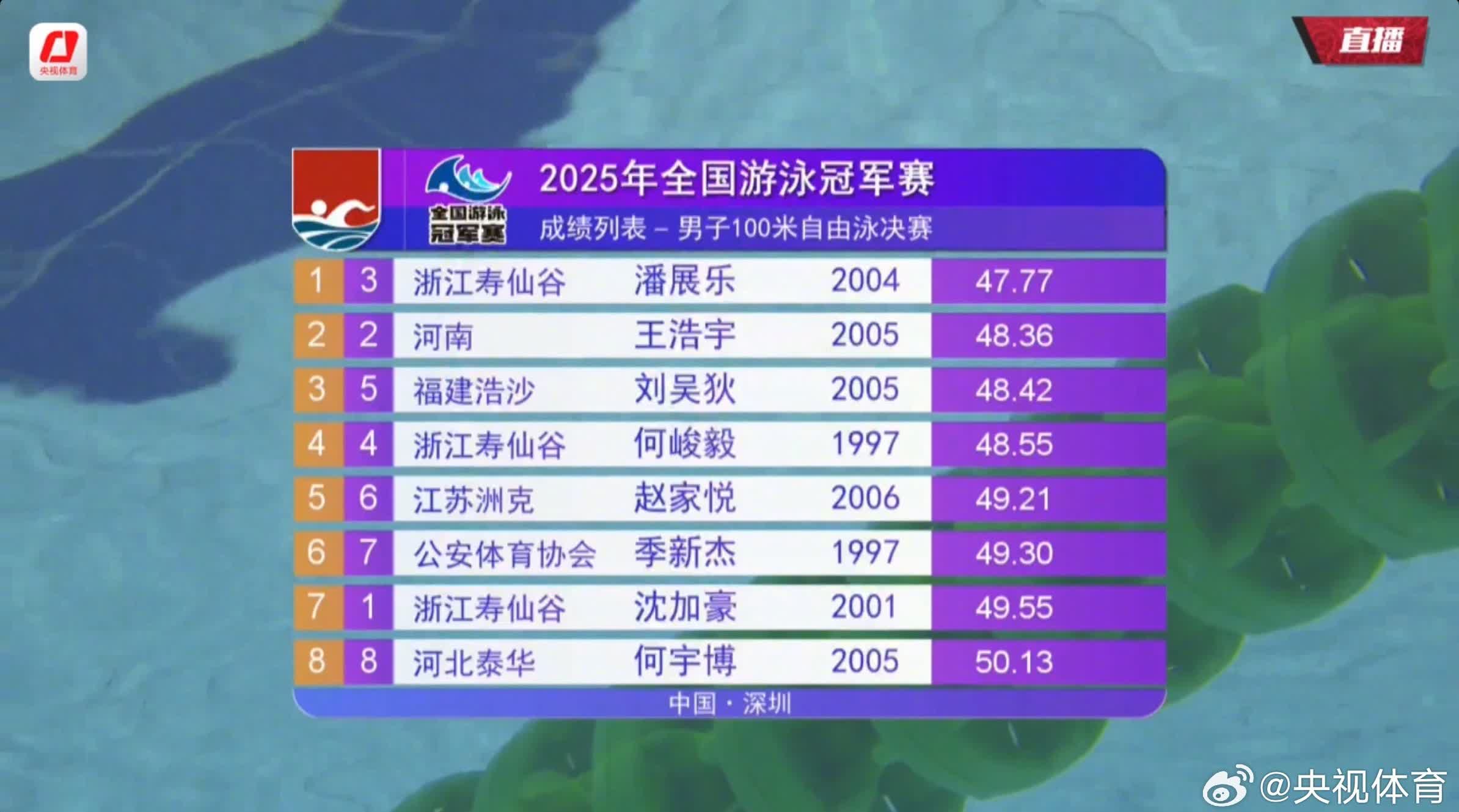 據央視新聞報道,2025全國游泳冠軍賽男子100米自由泳決賽,潘展樂以47秒77的成績獲得金牌!