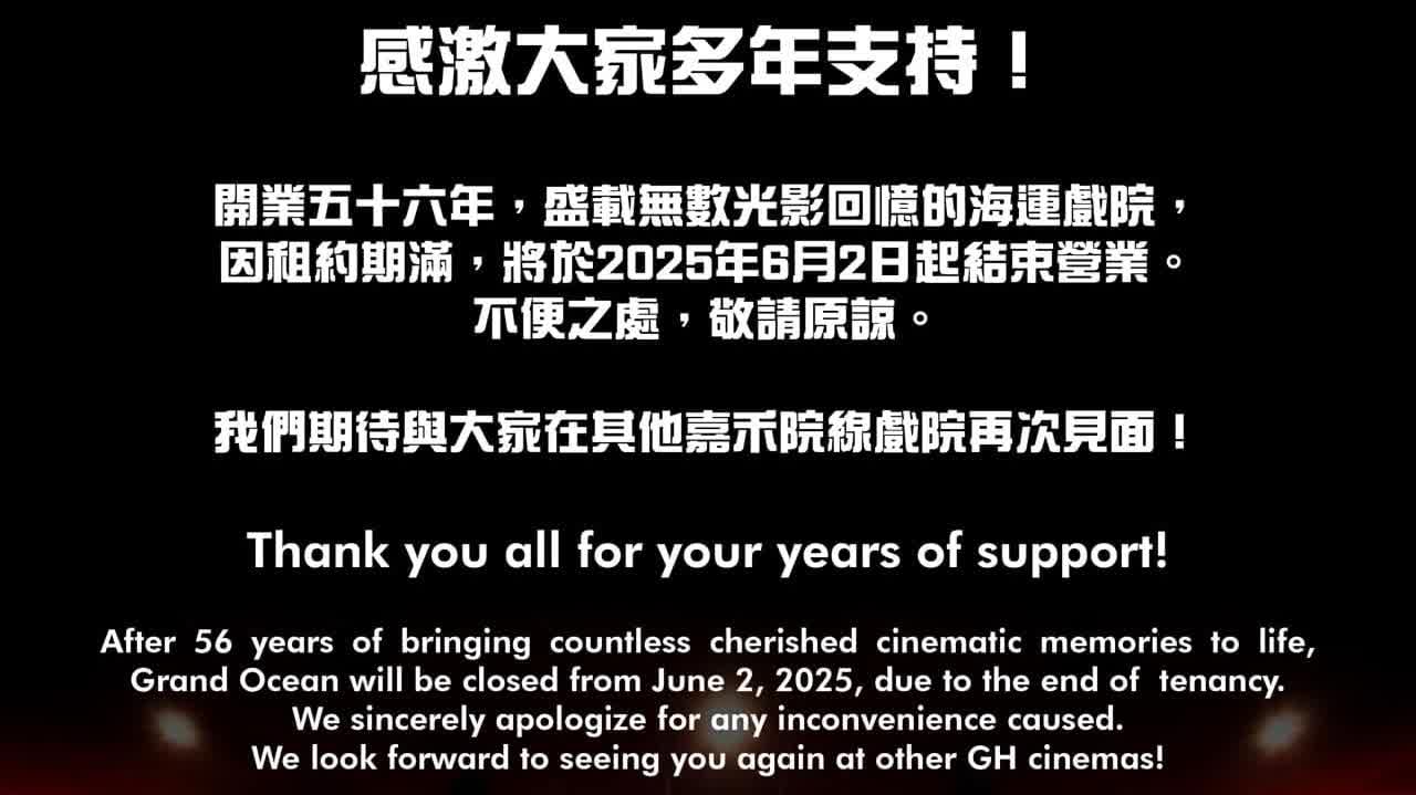 經營逾半世紀的尖沙咀海運戲院將於6月2日結束營業,這是繼位於康山的康怡戲院後,一星期內第二間戲院宣布結束營業,亦是今年第4間結業的戲院。