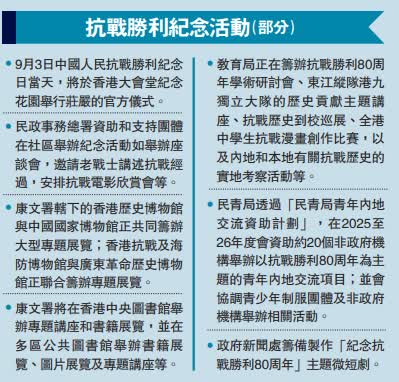 另外,教育局正在籌辦的系列活動包括抗戰勝利80周年學術研討會、東江縱隊港九獨立大隊的歷史貢獻主題講座、抗戰歷史到校巡展、全港中學生抗戰漫畫創作比賽,以及內地和本地有關抗戰歷史的實地考察活動等民政及青年事務局也將透過「民青局青年內地交流資助計劃」,在2025至26年度會資助約20個非政府機構舉辦以抗戰勝利80周年為主題的青年內地交流項目,名額約1000個;民青局同時會協調青少年制服團體及非政府機構舉辦相關活動。