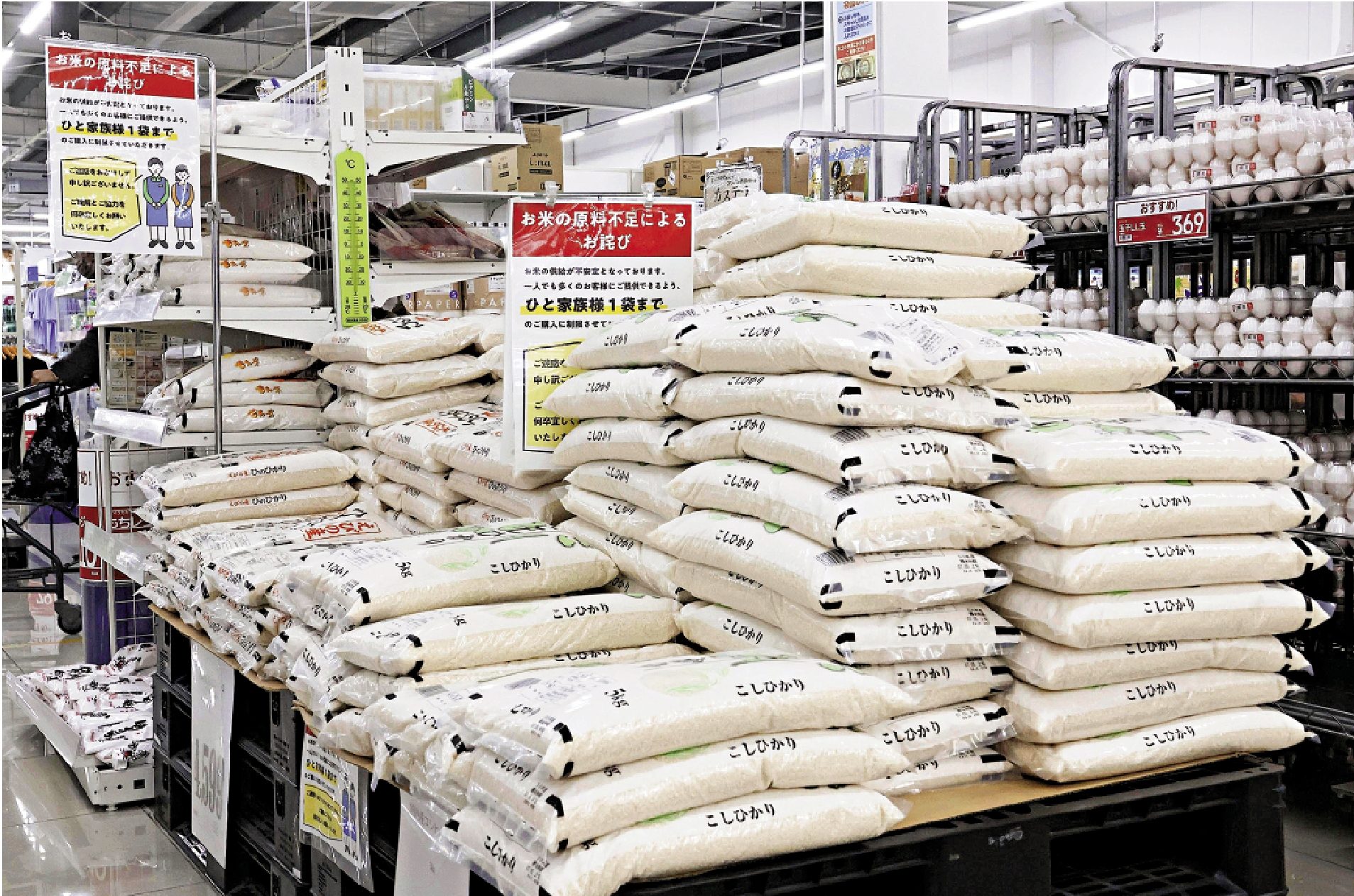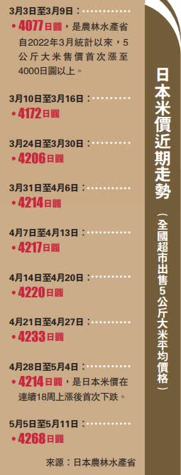 目前日本超市的米價平均價格仍貴。當局3月釋出儲備米以後,效果依然有限,近期5公斤大米平均價格仍超過4200日圓,為去年同期的2倍。