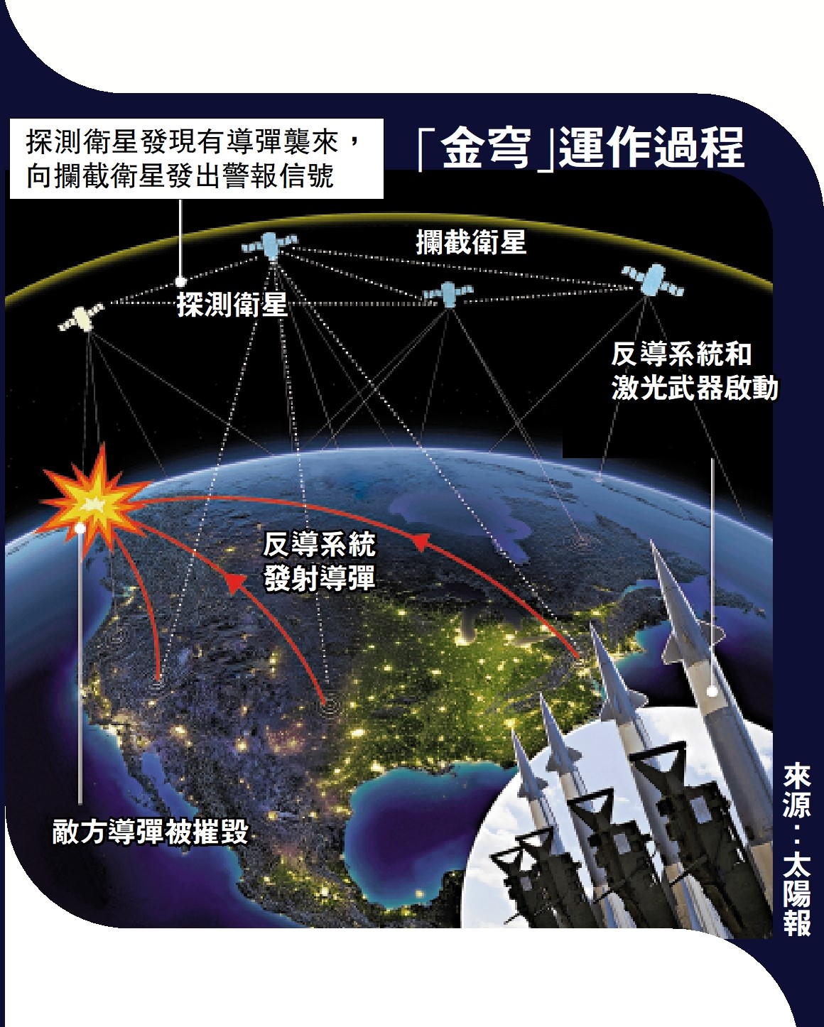 美國總統特朗普今年1月上任後下令建造美國「鐵穹」防禦體系,2月將該系統更名為「金穹」。5月20日,特朗普公布「金穹」天基導彈防禦系統發展規劃,稱其將與美國現有的導彈防禦能力整合,一旦完全建成,將能夠攔截從世界其他地方甚至太空發射的導彈。該計劃的核心是建立一個由數千顆小型衛星組成的衛星群,主要包括導彈探測衛星和導彈摧毀衛星。