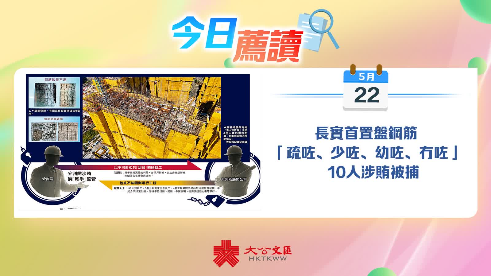大公報頭版頭條。長實位於觀塘安達臣道的「港人首置盤」住宅項目,被揭發地盤分判商涉嫌行賄工程監督人員換取寬鬆監管,以賺取更多利潤,造成地盤全部6座大樓的鋼筋配置與圖則不符,出現鋼筋「疏咗、少咗、幼咗、冇咗」等情況。