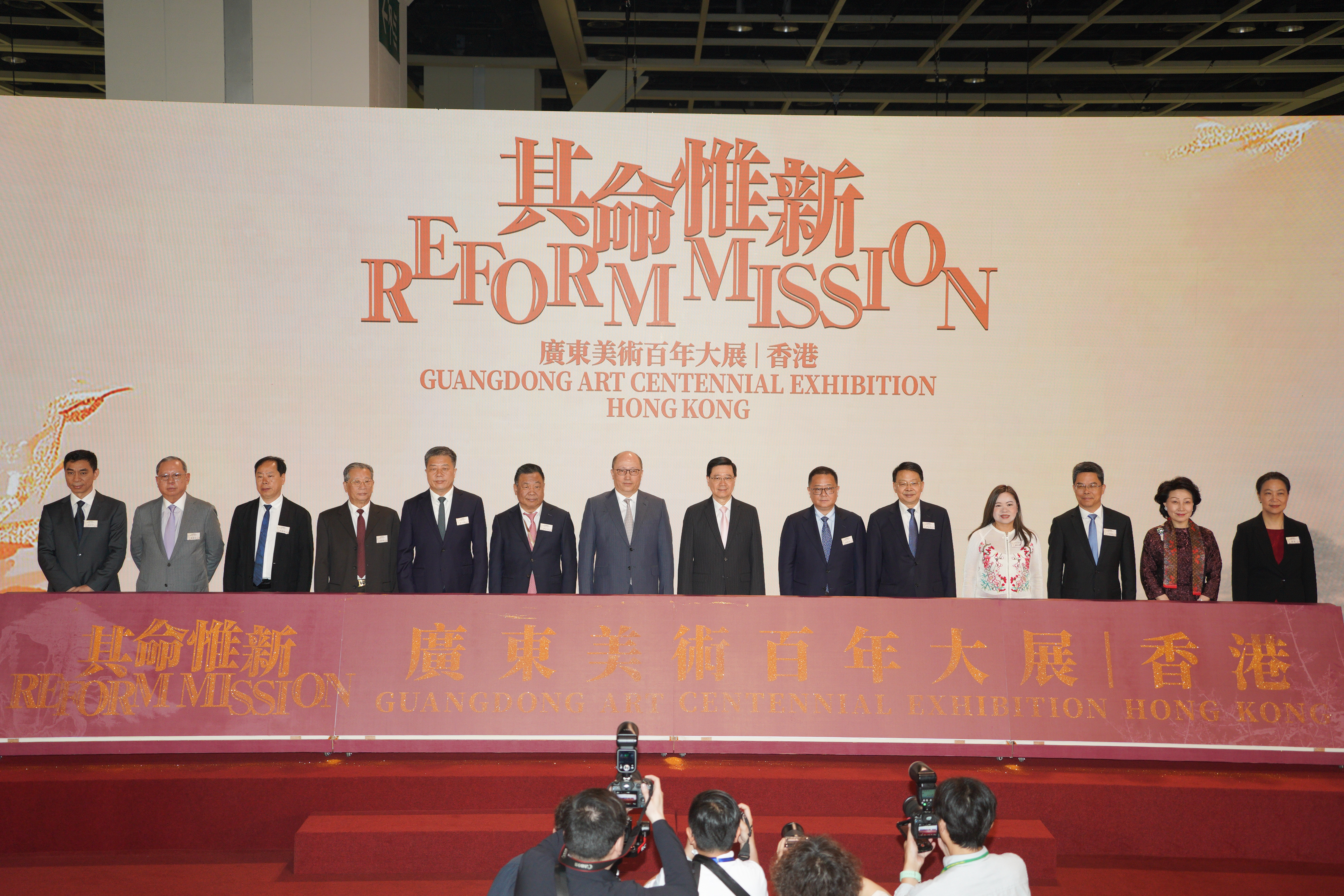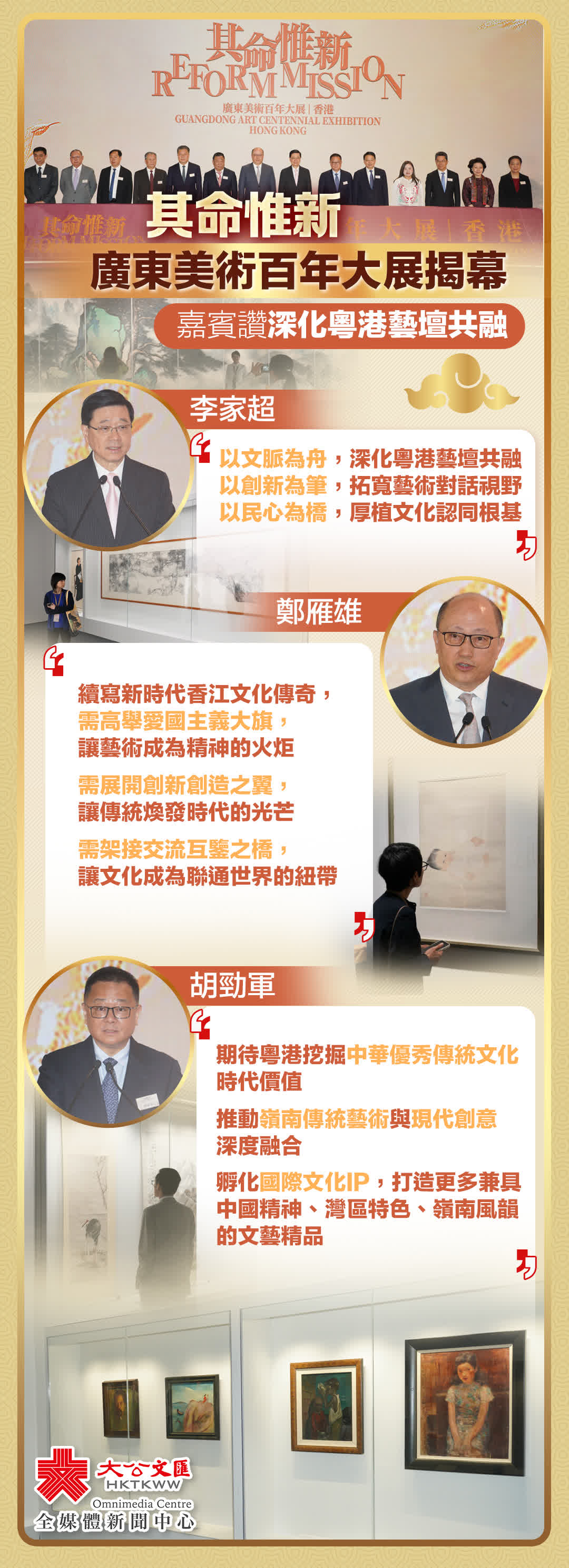 大公文匯全媒體報道,由廣東省文化和旅遊廳、香港特區政府文化體育及旅遊局、廣東省文聯、紫荊文化集團聯合主辦,廣東美術館、香港文聯、廣東省美術家協會、中國對外藝術展覽有限公司和紫荊雜誌社承辦的「其命惟新──廣東美術百年大展(香港)」,將於5月22日至6月2日期間,在香港會議展覽中心舉辦。展覽開幕典禮今日(22日)上午在香港會議展覽中心舉辦,特區行政長官李家超,中央政府駐港聯絡辦主任鄭雁雄,廣東省委常委、宣傳部部長胡勁軍出席開幕典禮並致辭。大公文匯全媒體整理嘉賓致辭要點,快來一圖睇清!