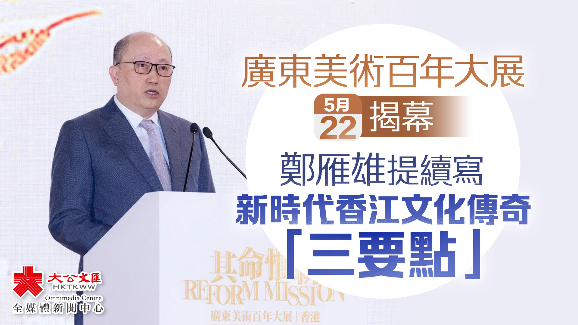 鄭雁雄指出,大展主題「其命惟新」既是百餘年廣東美術的發展主線,也是百餘年香港經濟社會的發展主線。此次大展,不僅是一次「不忘本來」的歷史回眸,更是一場「面向未來」的深情展望;不僅是一次跨越時空的文明對話,更是一場血脈相連的心靈共振;不僅是一道照鑒古今的視覺盛宴,更是一曲激蕩靈魂的文化禮讚。展品充分展現了藝術家們堅守中華審美理想,在民族顛沛、家國飄搖之時堅守傳承,在對外開放、交流互鑒之中堅定自信。這一文化自信與兼容革新的辯證關係,對於香港當下如何實現創新發展、更好發展,做出新的成績、更大貢獻,有重要啟示意義,也是香港「一國兩制」實踐必須堅持的重要經驗。