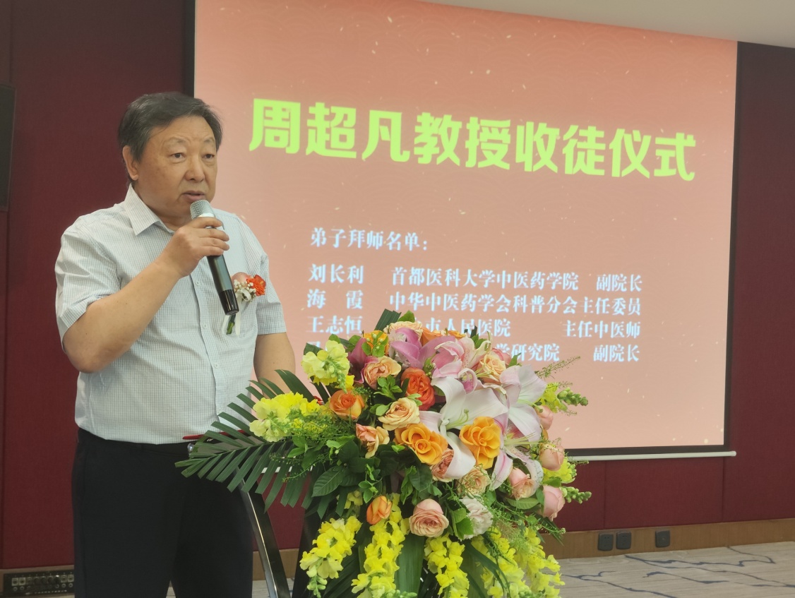 會議以國家級非遺「中醫診法」傳承人周超凡教授的收徒儀式拉開序幕。這位被譽為「現代中醫治則學奠基人」的全國名中醫、首都國醫名師,現場接納劉長利、海霞、王志恒、馬中凱四位學術臨床雙優的中青年專家為徒。