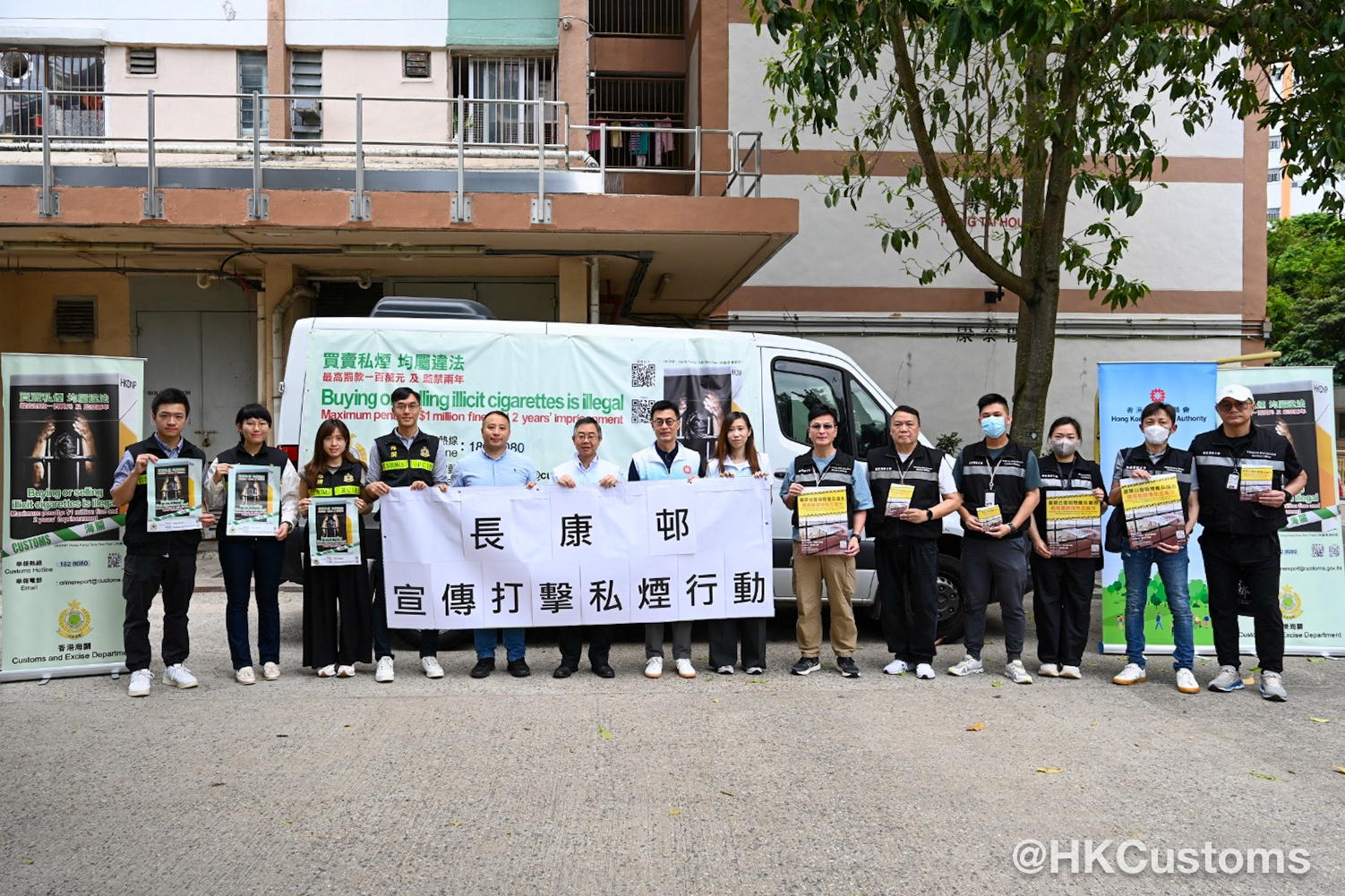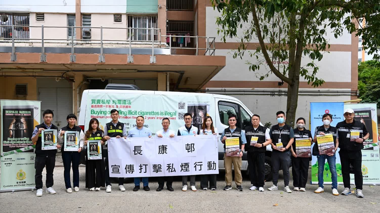 香港海關五月十五日與葵青區區議員、衞生署控煙酒辦公室及房屋署在青衣長康邨及長青邨進行聯合反私煙宣傳活動。