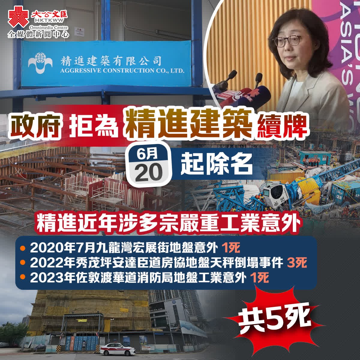 甯漢豪表示,精進建築近年涉及2020年、2022年及2023年發生的三宗嚴重地盤安全事故,導致5人死亡。牽涉安達臣道房協地盤天秤倒塌3死6傷嚴重事故的承建商精進建築的註冊原定於2023年4月屆滿,屋宇署在收到續期申請後,轉交建築承建商註冊事務委員會進行面試及評審。經審慎考慮委員會建議,屋宇署決定拒絕其續期申請。