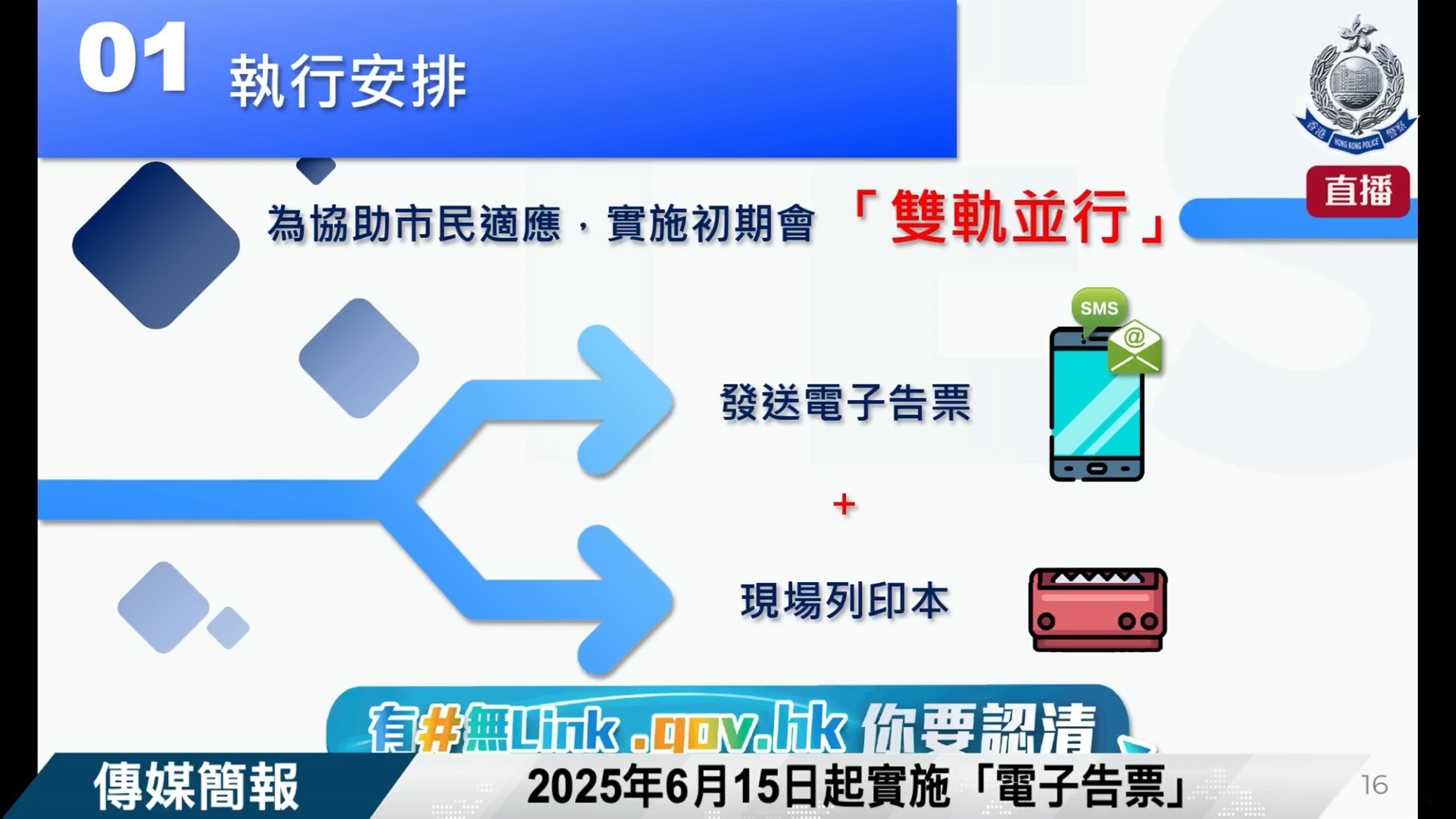 今年6月15日起,如車主、駕駛執照及相關牌照持有人,已經向運輸署提交已核實的電子聯絡方式。警方於發出告票時,就會根據該電子聯絡方式發出電子告票。如提供的是流動電話,違例人士會收到短訊告票;如提供的是電郵地址,違例人士則會收到電郵告票。如果駕駛人士仍未向運輸署提交已核實電子聯絡方式,他們將不會收到電子告票,而只會收到實體告票。