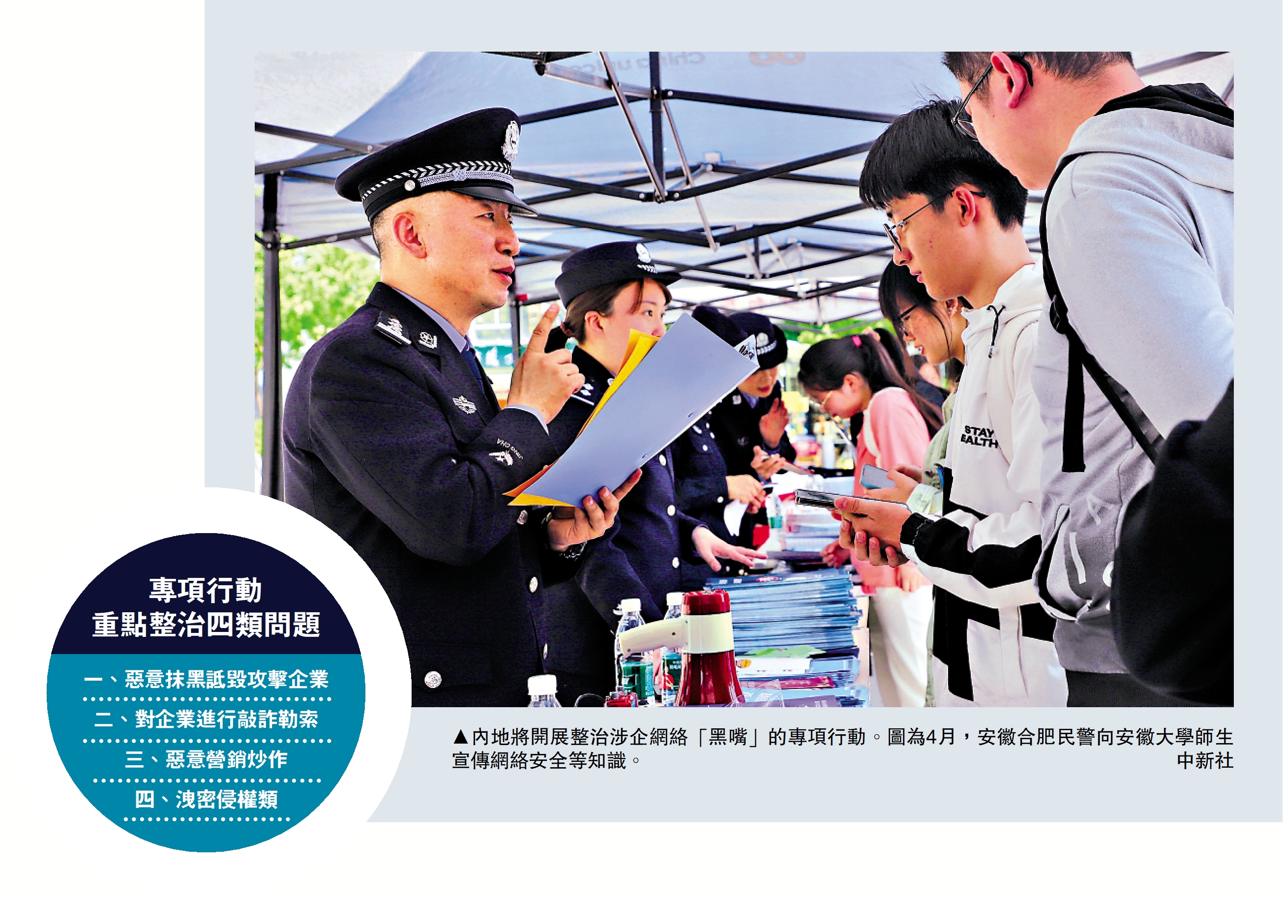 (大公報 記者 趙一存 北京報道)中央網信辦22日發布通知,將在全國範圍內開展為期2個月的「清朗·優化營商網絡環境─整治涉企網絡『黑嘴』」專項行動,重點整治惡意抹黑詆毀攻擊企業、對企業進行敲詐勒索等四類突出問題。
