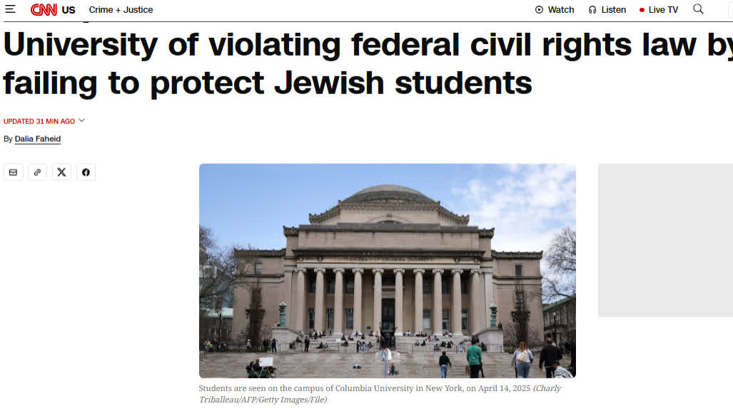 報道指,美國衞生與公眾服務部民權辦公室指控哥倫比亞大學違反了1964年《民權法案》第六章,該法案禁止在接受聯邦資助的項目和活動中基於種族、膚色和國籍進行歧視。