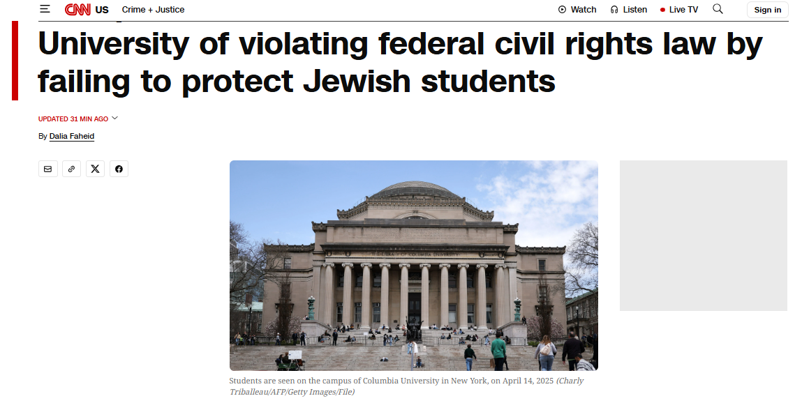 大公文匯全媒體報道,據美國有線電視新聞網(CNN)報道,美國政府當地時間周四指控哥倫比亞大學自2023年10月以來對校園內猶太學生受到的騷擾「故意漠視」,違反了聯邦民權法。
