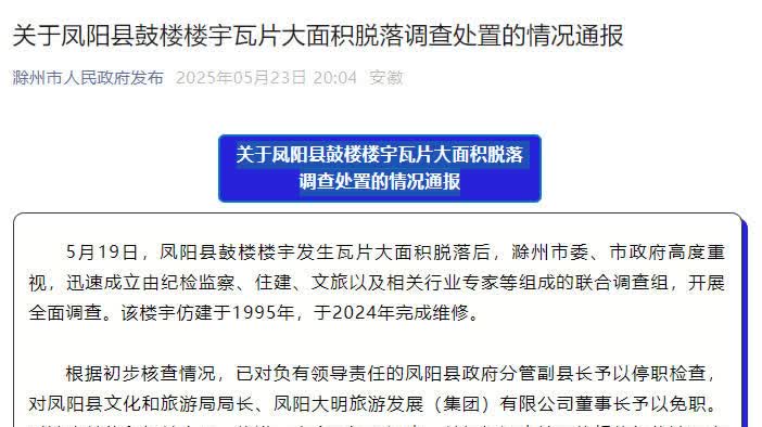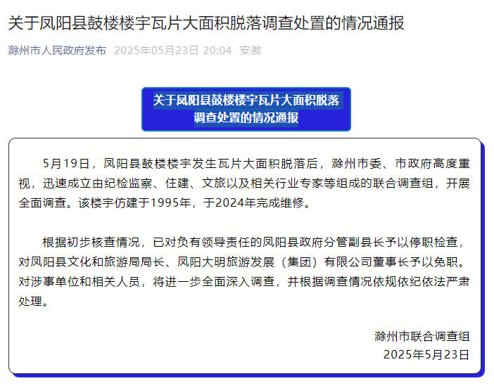 5月19日,鳳陽縣鼓樓樓宇發生瓦片大面積脫落後,滁州市委、市政府高度重視,迅速成立由紀檢監察、住建、文旅以及相關行業專家等組成的聯合調查組,開展全面調查。該樓宇仿建於1995年,於2024年完成維修。
