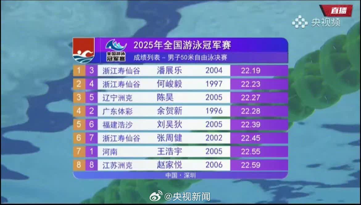 據央視新聞報道,今天(23日),2025年全國游泳冠軍賽男子50米自由泳決賽,潘展樂以22秒19的成績獲得金牌!這也是他在本次賽事中摘得的第七枚金牌。